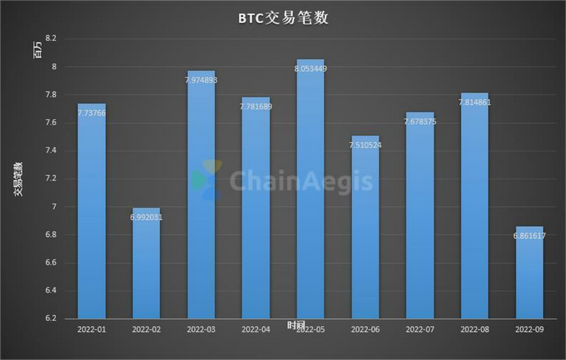 可以看到,在本季度中,9月链上交易尤为寡淡,仅占比本季度30.97%。交易次数从上月781.4万变成了686.1万,降幅达12.19%。这很有可能是受到以太坊合并的影响。