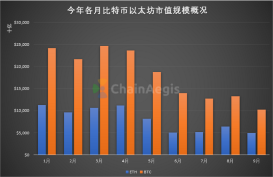 在第三季度中,备受关注的以太坊顺利合并,是区块链历史上又一大里程碑式突破。但在合并前后,由于投资者对于以太坊合并的看法见仁见智,对区块链影响颇大。在本文中,SharkTeam基于ChainAegis链上分析平台将从链上数据角度进行追溯,判断较上一季度发生了哪些变化。 截止到9月27日,比特币正在不断试探今年的低点。比特币市值平均为407,517,058,067美元,与上一季度相比,下降了34.13%。自9月15日以太坊合并后,比特币价格曾多次低于2万美元,在本季度一度跌至18,464.3美元,且在过去三个月比特币对美元的投资回报率(ROI)为-10%,而其对美元的年度投资回报率为53.38%,从短期或者长期的低投资回报率均表明短期和长期BTC持有者都遭受到了净亏损。这令比特币几乎失去了其对冲通胀的说法。 ETH本季度市值平均为185,493,639,736美元,与上一季度相比,下降了31.62%。