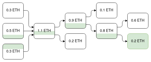 右下角的 0.2 ETH UTXO 的提取可以通过展示其历史中的任何 UTXO 的提取来取消,如绿色所示。特别要注意的是,左中和左下的 UTXO 是祖先,但左上的 UTXO 不是。这种方法类似于 2013 年左右的染色币协议中的基于顺序的着色思想。