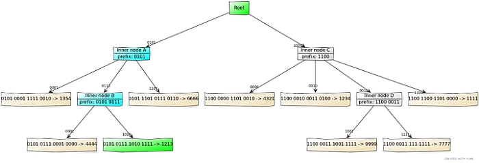 然而,以太坊使用 16 个子节点,因为它在树中存储“状态”。以太坊有一个树,其中键是地址,值是余额、nonce、代码等。这种树的问题在于与地址关联的余额和 nonce 等值会发生变化,并且随着用户涌入会生成新地址。也就是说,修改和插入频繁发生,因此需要减少这些成本。因此,以太坊通过在 hexary 树中编码键进行了优化,导致有 16 个子节点。有关优化的详细信息超出了本文的范围,但感兴趣的人可以参考以下文章 。