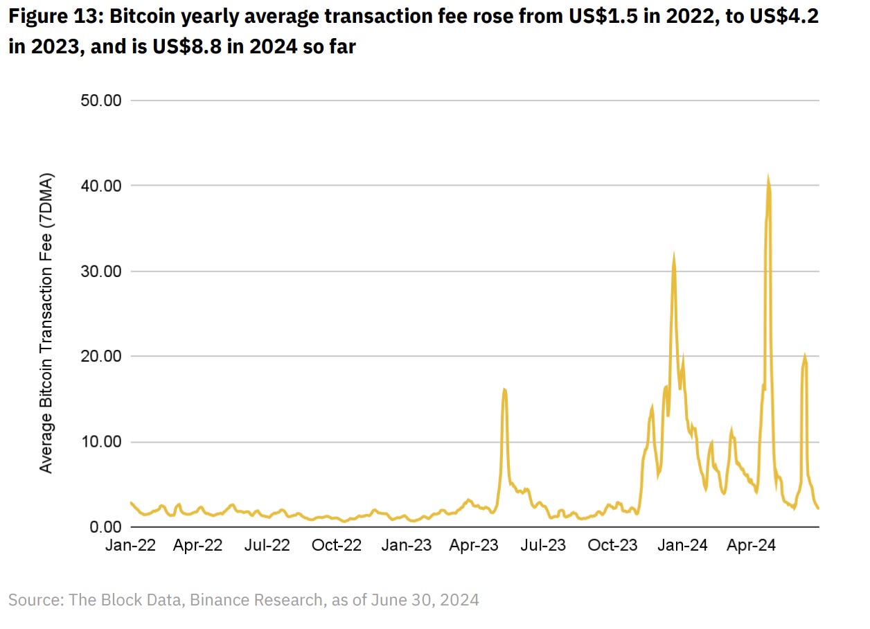 用户驱动的活动,例如我们在 Ordinals、BRC-20 和 Rune 中看到的那样,以及 L2 的使用,通过为矿工生成额外收入提供了解决方案。虽然 L1 上的活动直接影响可用性,增加费用和拥堵,但 L2 允许用户在一个快速、低成本的环境中受益于比特币的安全性,同时仍然为矿工生成收入。几年后,比特币可能主要被视为 L2 的结算层,大多数执行发生在这些二级层上,就像以太坊现在的情况一样。