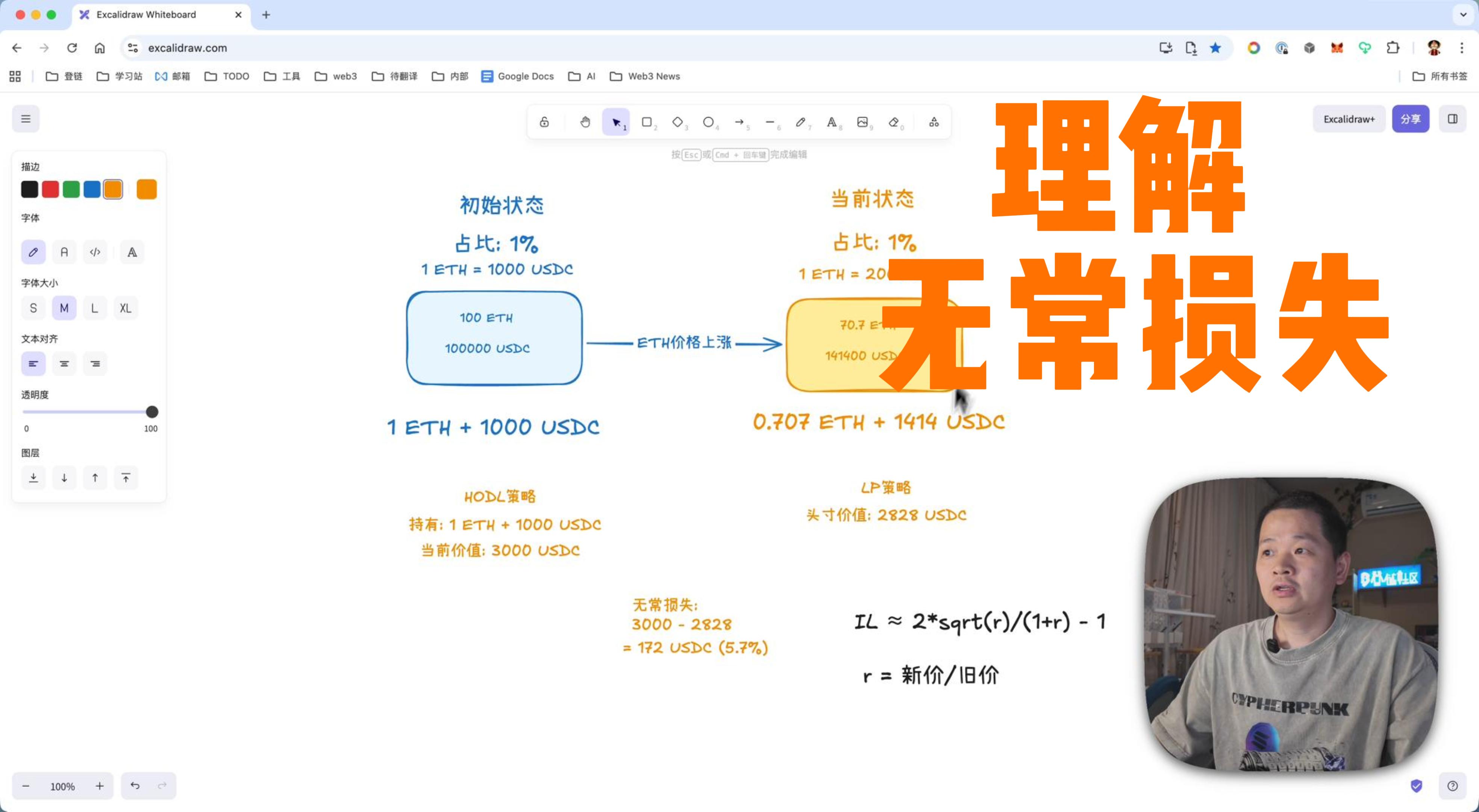 视频 AI 总结: 该视频解释了 DeFi 领域中常见的“无常损失”概念。无常损失是指当用户为去中心化交易所(DEX)提供流动性时,由于代币价格波动,其持有的资产价值低于简单持有这些代币的价值。这种损失是“无常”的,因为如果价格恢复到初始状态,损失可能会消失。但如果用户在价格波动时撤回流动性,损失将变为永久性的。 关键信息: * 无常损失是由于做市商提供的两种代币价格波动造成的。 * 当代币价格发生变化时,流动性池中的代币数量会根据“k不变”原则进行调整。 * 如果价格变动后退出流动性,获得的代币价值可能低于简单持有代币的价值,这就是无常损失。 * 视频中提供了一个具体的 ETH/USDC 例子,展示了价格变化如何导致无常损失。 * 视频中给出了一个近似公式,用于估算无常损失的大小,该公式基于新价格与原价格的比率。