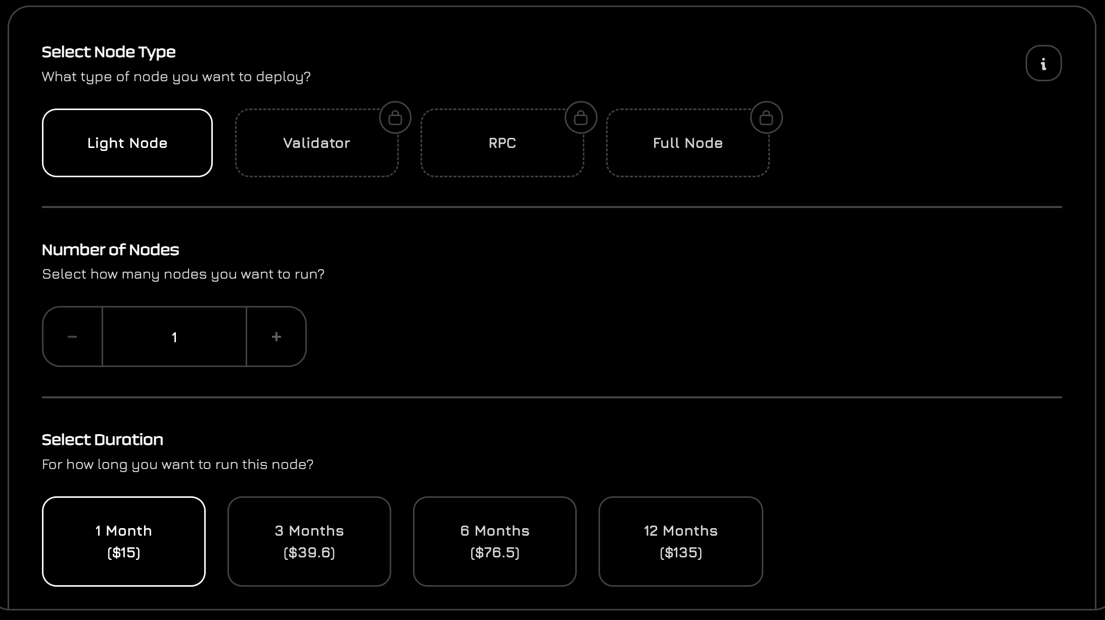 NodeOps 使参与者和开发人员能够通过 NodeOps 控制台 轻松设置节点,提供无需额外设置且只需点击几下的预设模板。截至今天(3 月 6 日),它支持七个协议:Celestia、XAI、Shardeum、Zora、Avail、Fuel 和 Powerloom,每个协议都需要各种类型的节点,例如验证器节点、完整节点、轻节点或 RPC 节点、存档节点等。