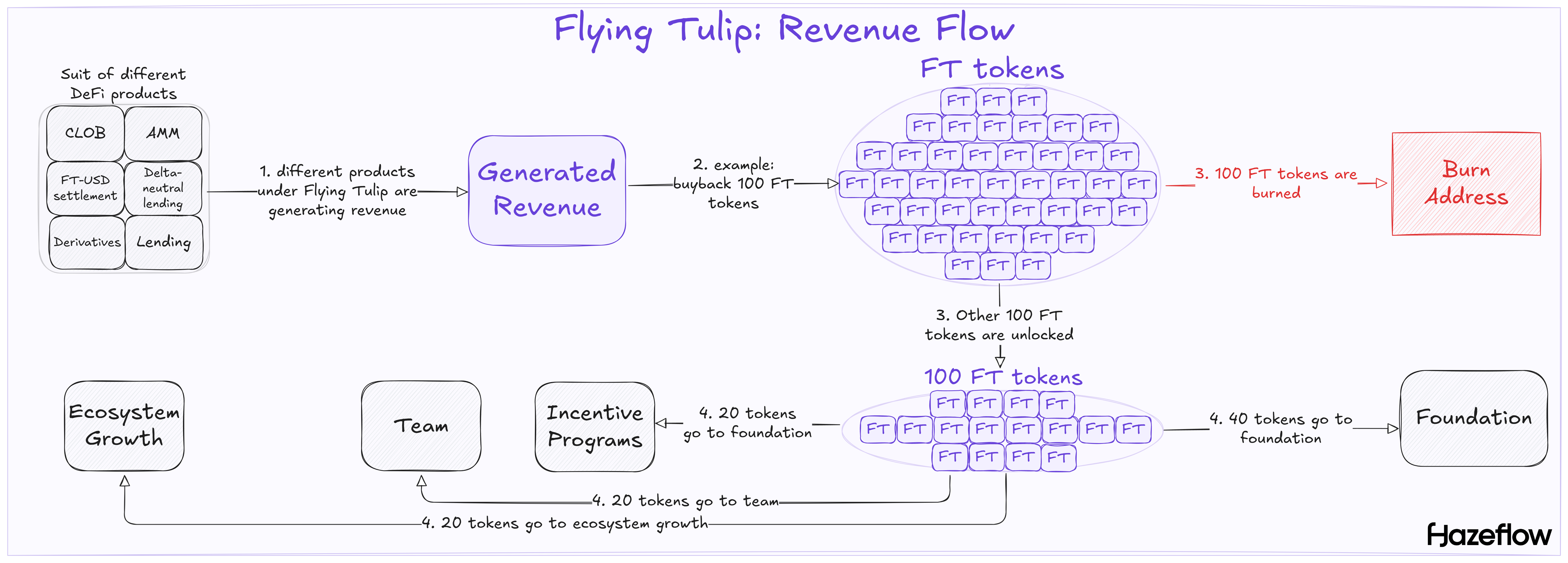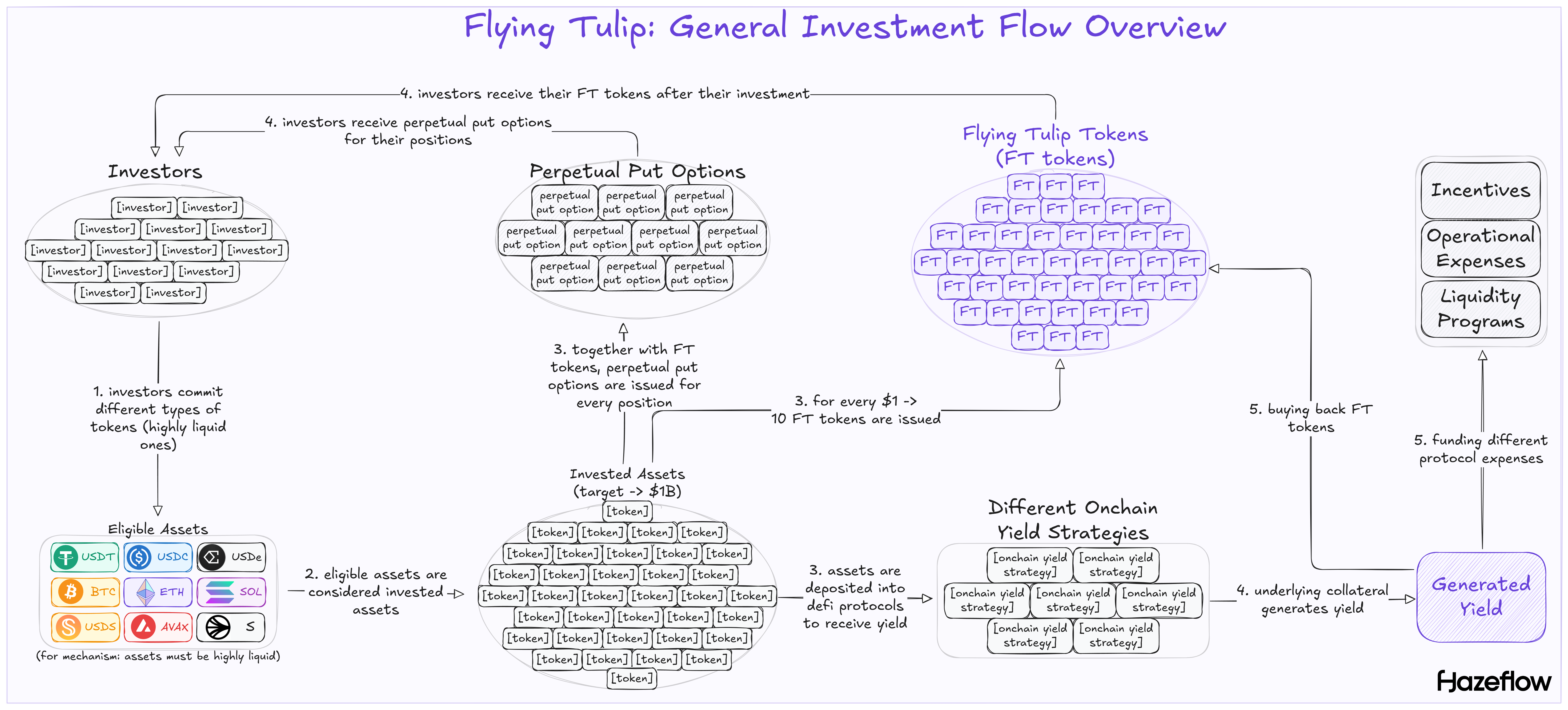 Hazeflow 提出了 Flying Tulip 创新型加密融资模型,该模型不直接花费融资资金,而是将资金再投资以产生收益,并将收益用于资助运营和回购代币。FT 代币伴随永久看跌期权发行,为投资者提供下行保护,即使代币贬值,也能以初始投资额售出。