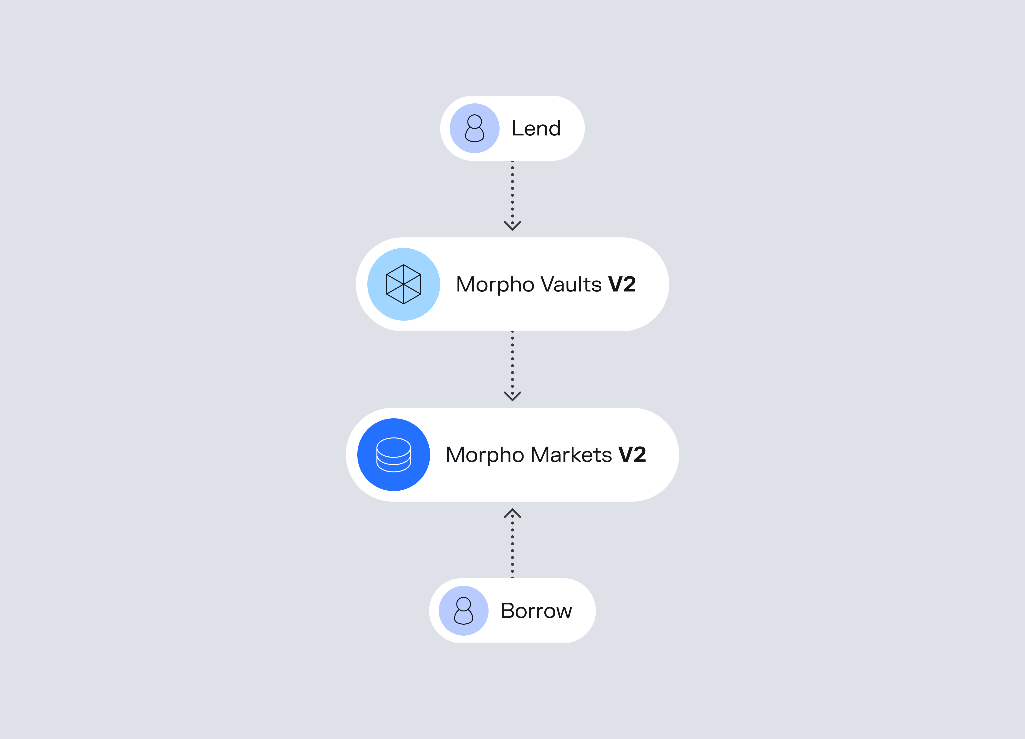 Morpho V2 是一个旨在实现这一愿景的基于意图的贷款平台。它由两个核心组件组成:Morpho Markets V2(“Markets V2”)和 Morpho Vaults V2(“Vaults V2”)。