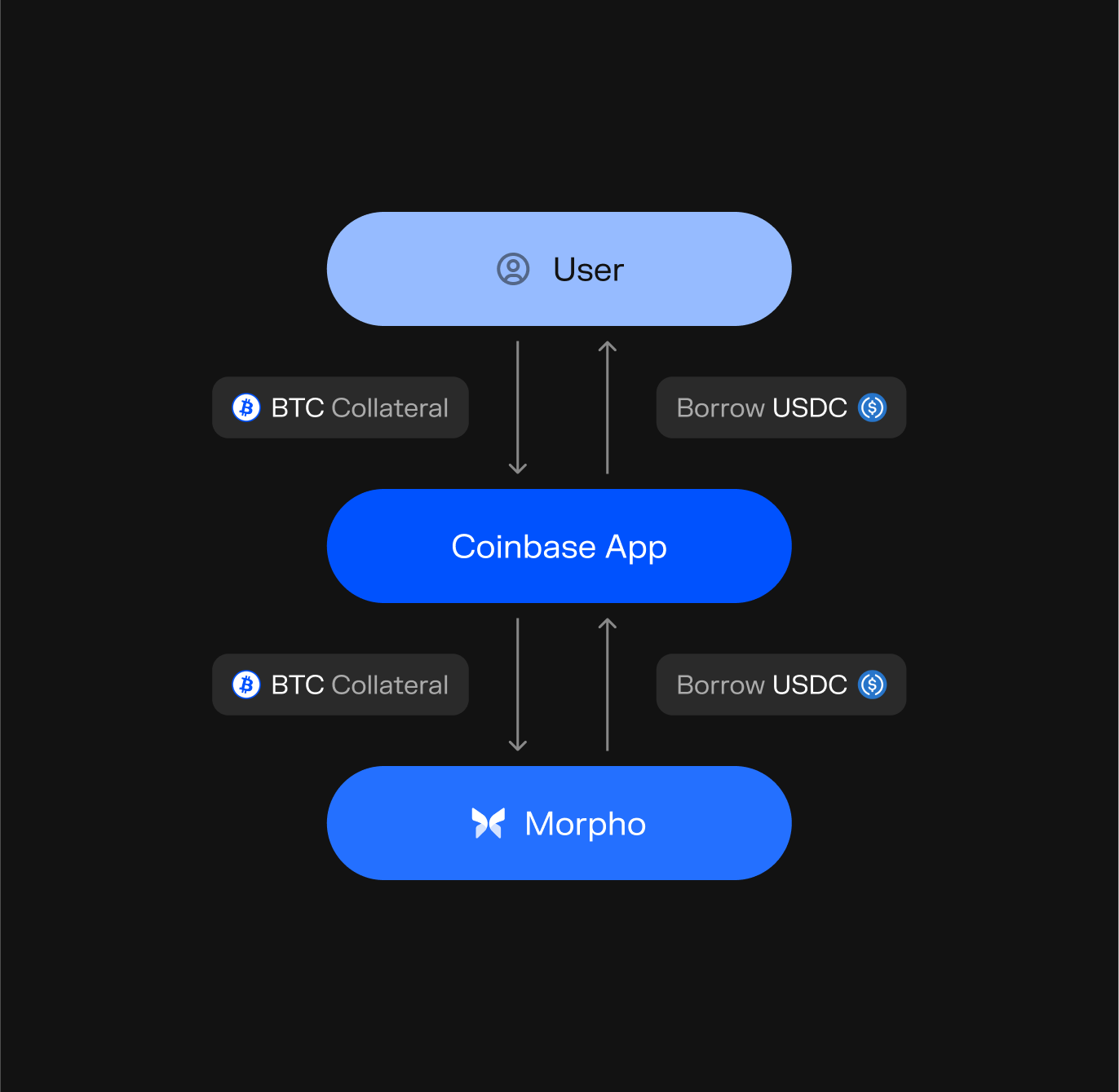 Morpho智能合约存储cbBTC抵押品,将借款需求与USDC流动性匹配,并处理利息、头寸会计和清算机制。