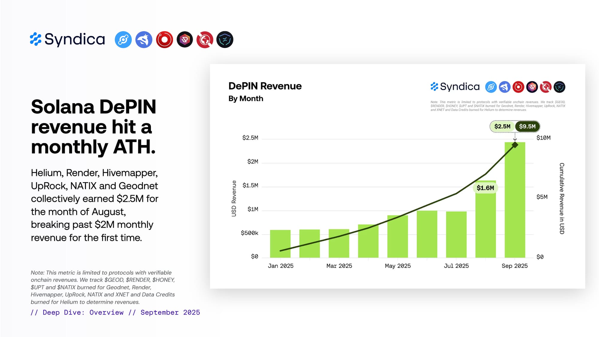Solana DePIN 的收入达到了月度历史最高点。Helium、Render、Hivemapper、UpRock、NATIX 和 Geodnet 在8月份的总收入为 250 万美元,首次突破每月 200 万美元的收入。