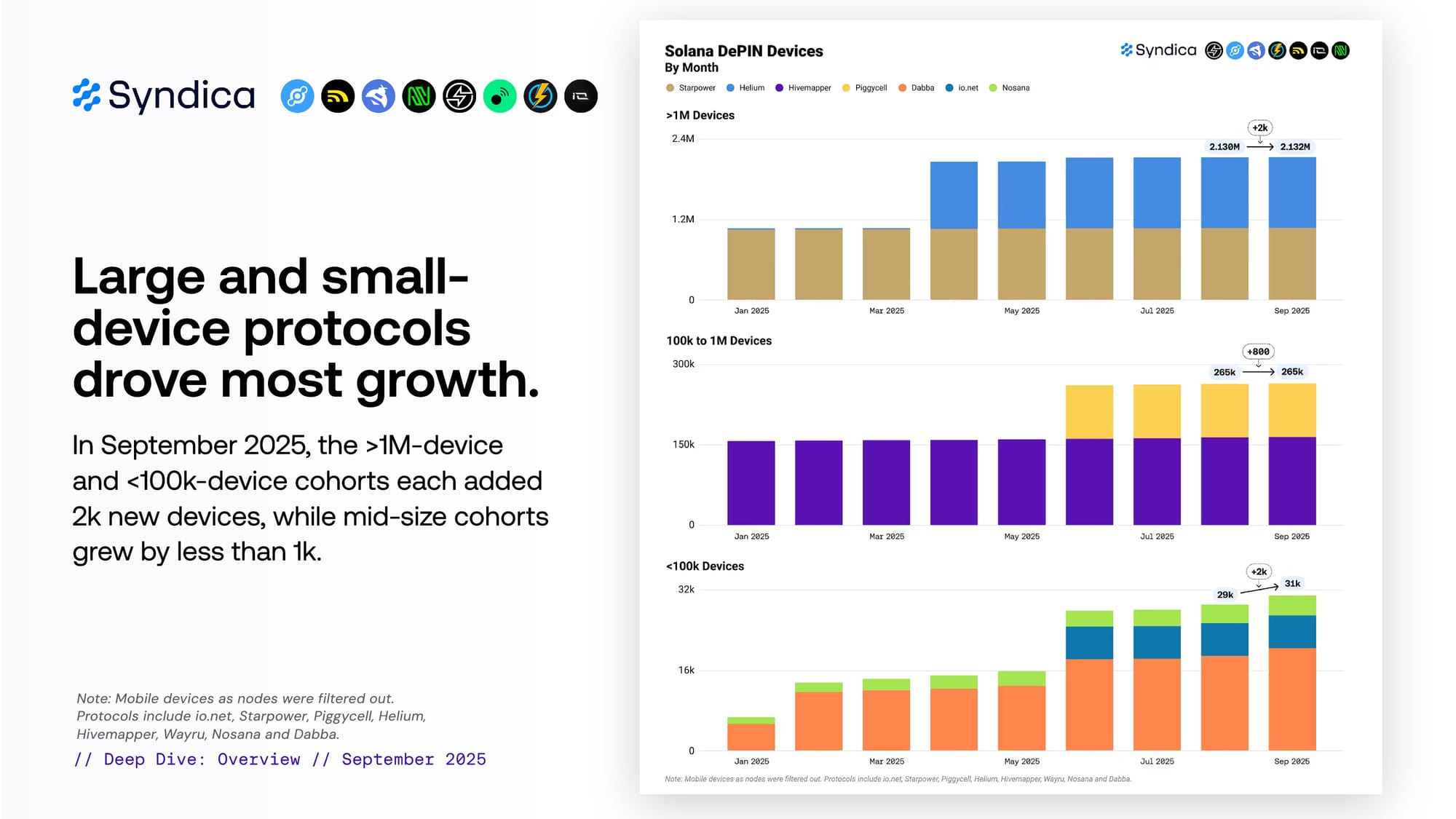 大型和小型设备协议推动了大部分增长。在 2025 年 9 月,设备数量超过100万和少于10万的 群组 各自新增了 2000 台设备,而中等规模的 群组 增长不到 1000 台。