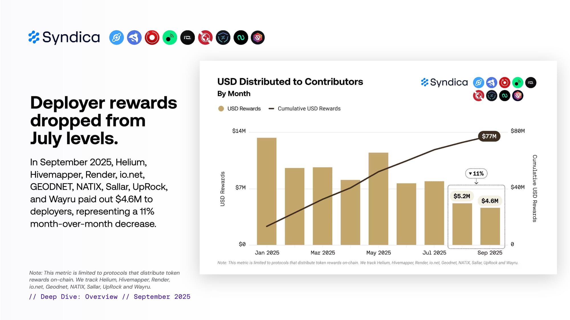 部署者的奖励从 7 月份的水平下降。在 2025 年 9 月,Helium、Hivemapper、Render、io.net、GEODNET、NATIX、Sallar、UpRock 和 Wayru 向部署者支付了 460 万美元,环比下降了 11%。