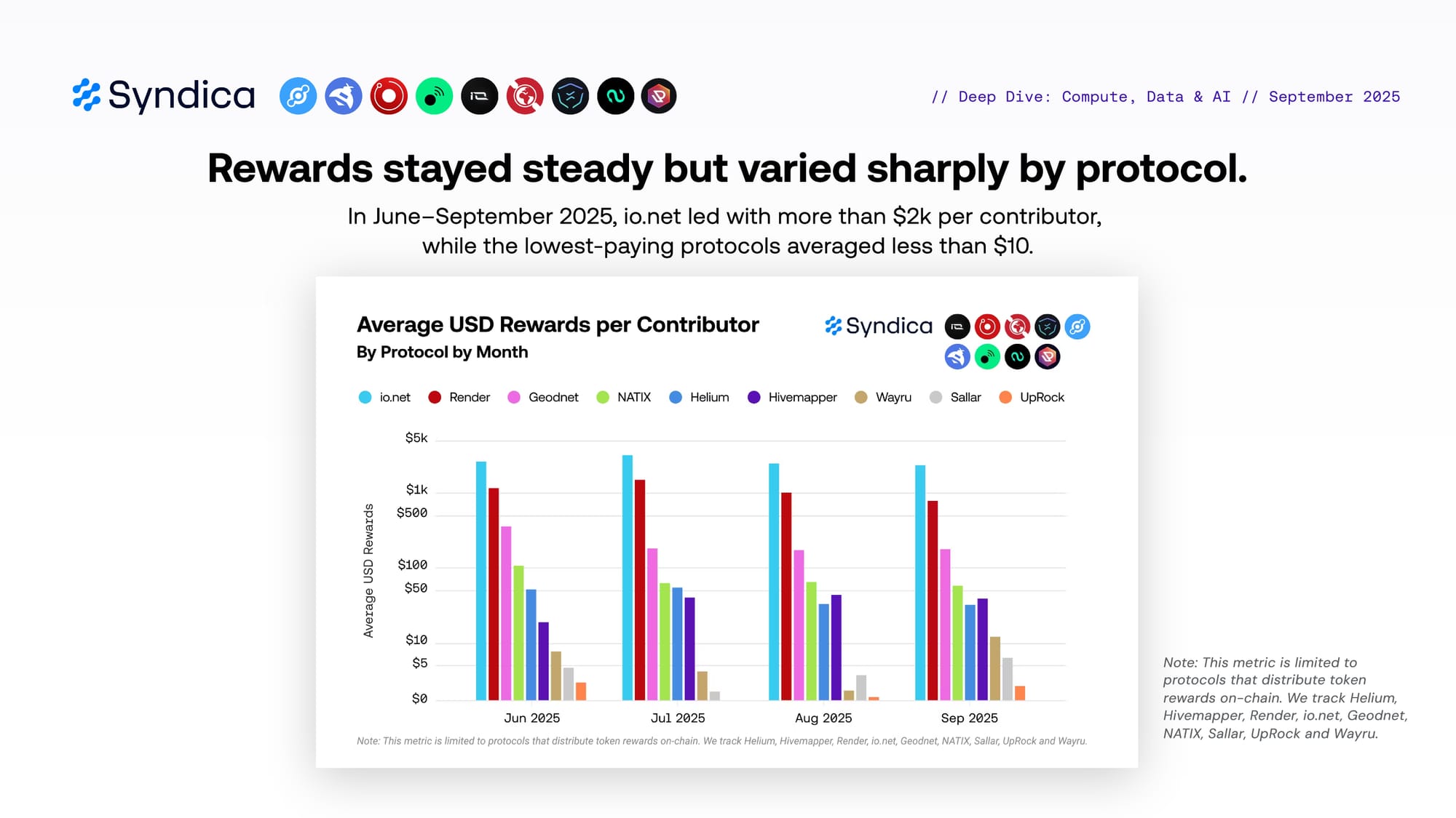 奖励保持稳定,但各协议之间的差异很大。在 2025 年 6 月至 9 月期间,io.net 以每位贡献者超过 2000 美元的奖励领先,而支付最低的协议平均不到 10 美元。
