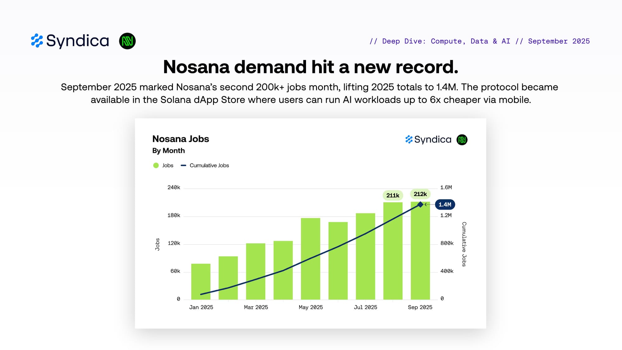 Nosana 的需求达到了新的记录。2025 年 9 月是 Nosana 第二个月完成 20 万个以上的工作任务,将 2025 年的总数提升到 140 万个。该协议已在 Solana dApp 商店上线,用户可以通过移动设备以高达 6 倍的更低价格运行 AI 工作负载。