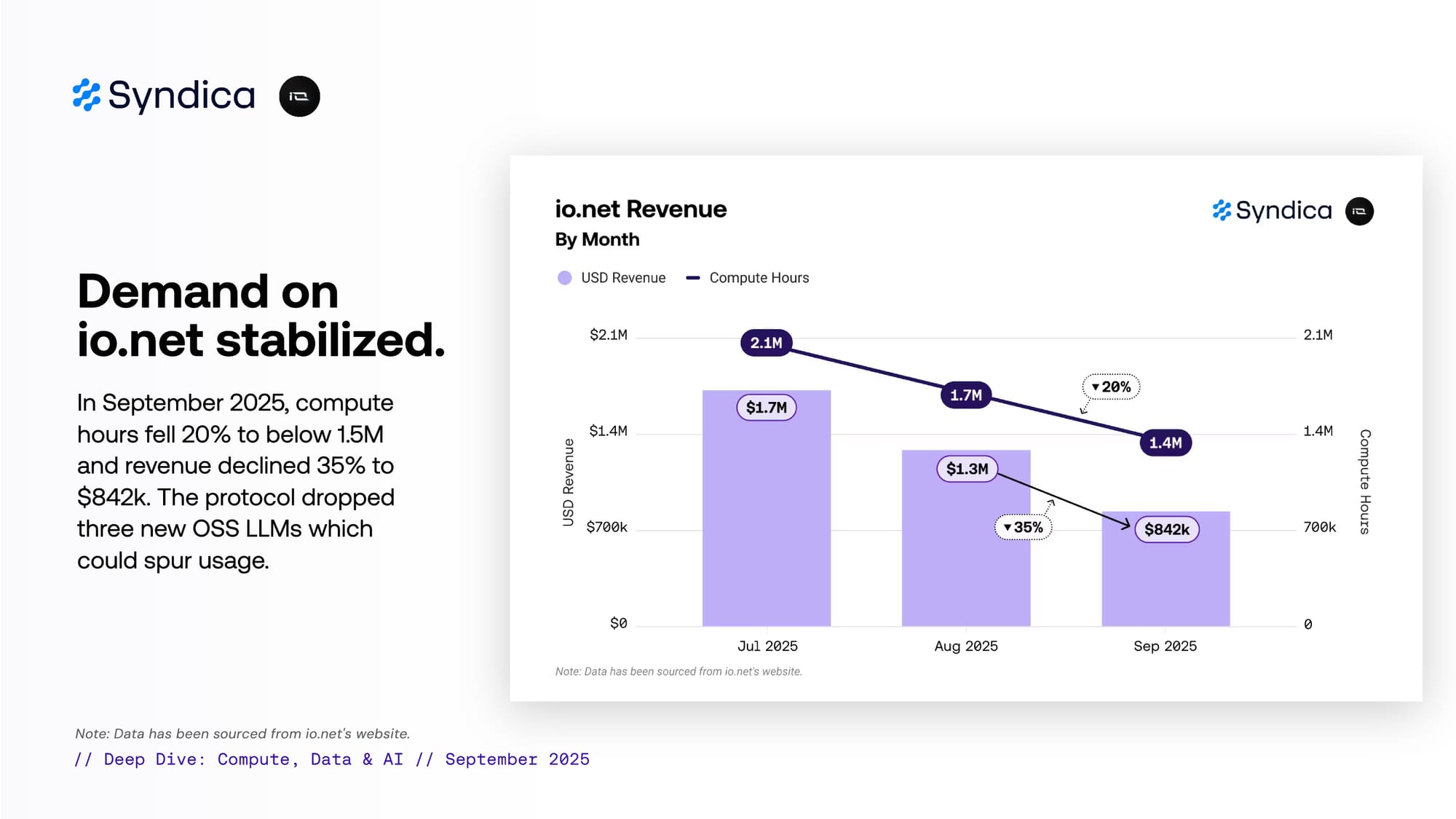 io.net 上的需求趋于稳定。在 2025 年 9 月,计算时长下降了 20%,降至 150 万小时以下,收入下降了 35%,降至 84.2 万美元。该协议发布了三个新的 OSS LLM,这可能会刺激使用。