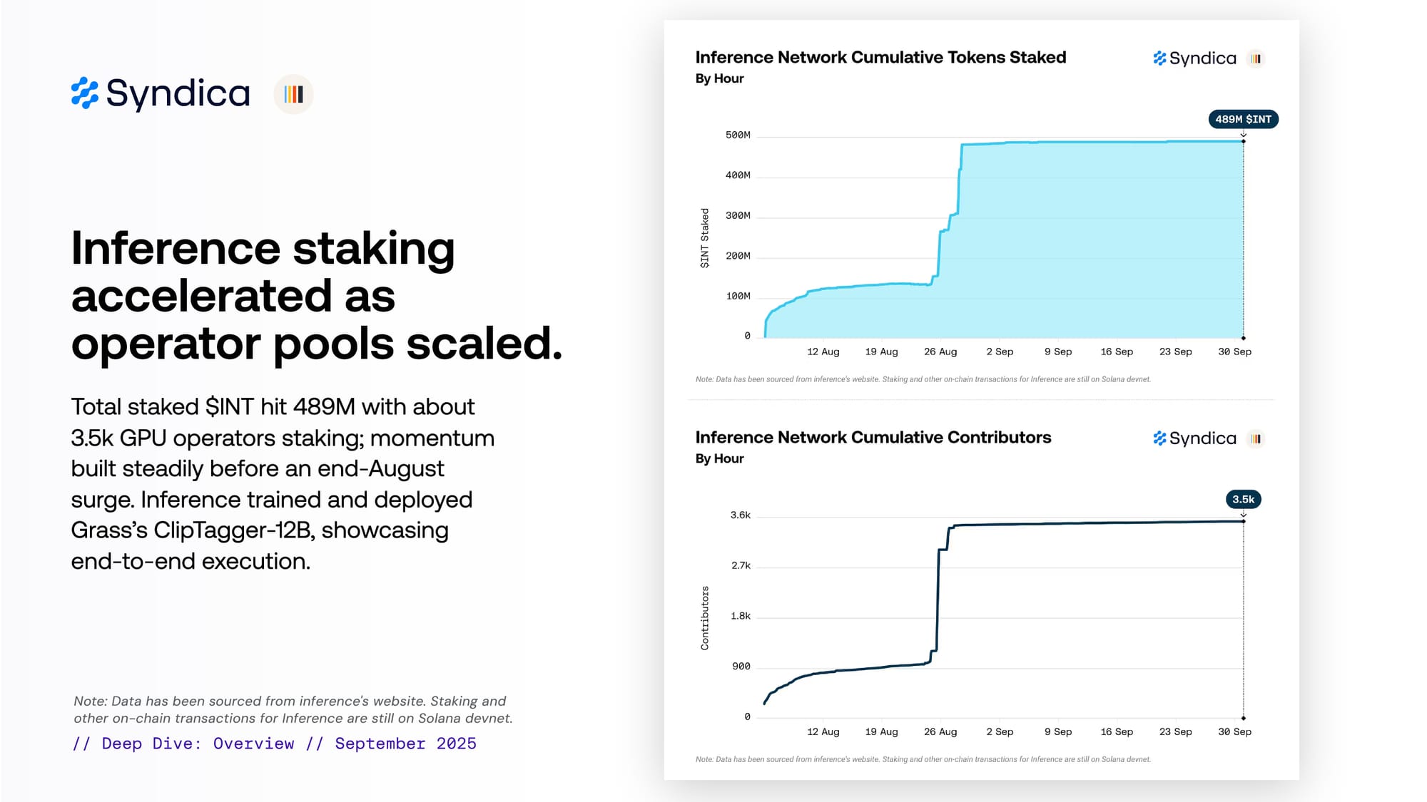 随着运营者池规模的扩大,Inference 质押加速。总质押的 $INT 达到 4.89 亿,约有 3500 个 GPU 运营者进行质押;在 8 月底激增之前,势头稳步增长。Inference 训练并部署了 Grass 的 ClipTagger-12B,展示了端到端的执行。