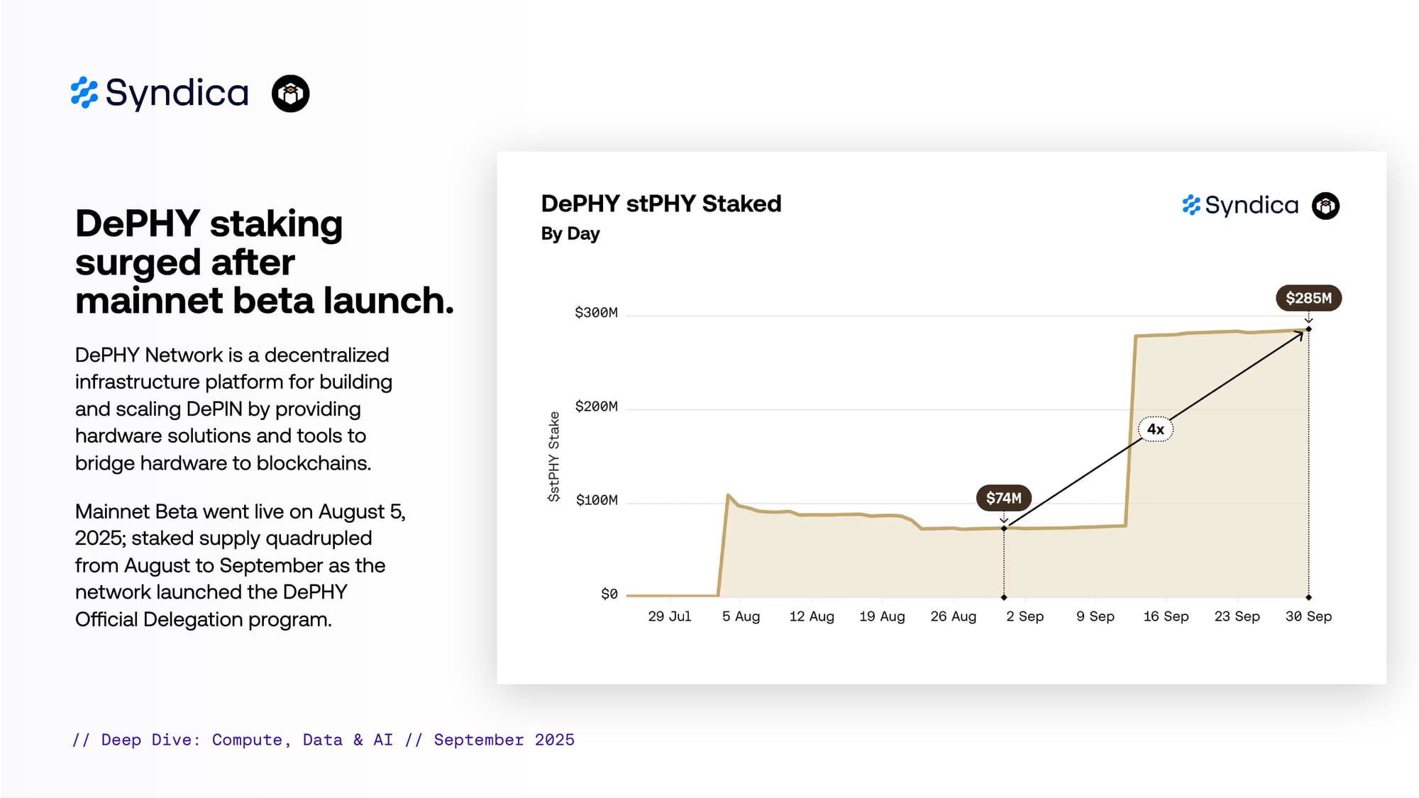 DePHY 主网 Beta 发布后,质押量激增。DePHY Network 是一个去中心化基础设施平台,通过提供硬件解决方案和工具将硬件连接到区块链,用于构建和扩展 DePIN。主网 Beta 于 2025 年 8 月 5 日上线;随着网络推出 DePHY 官方委托计划,质押供应量从 8 月到 9 月翻了两番。