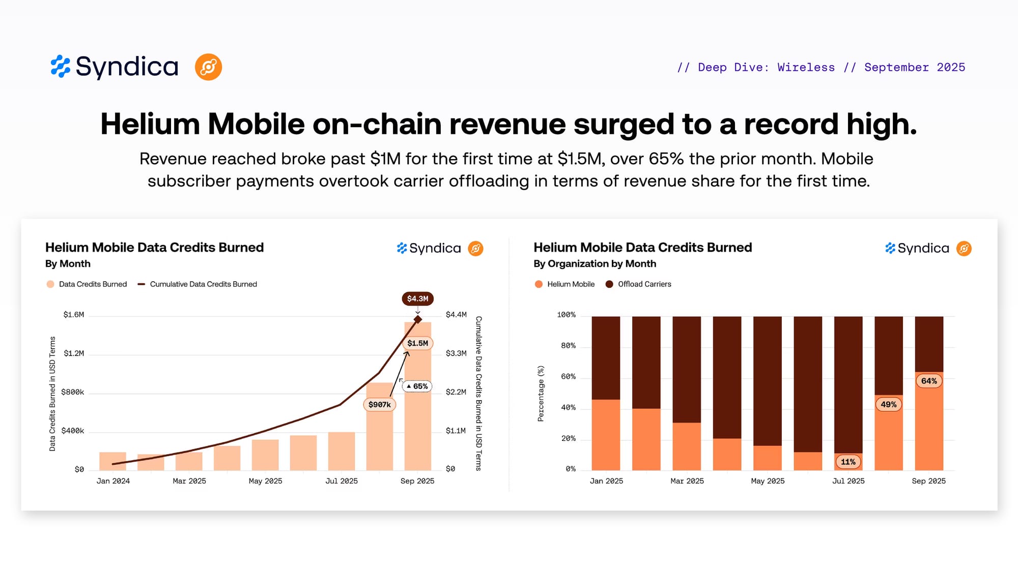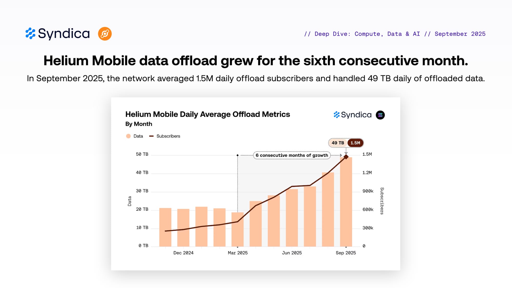 Helium Mobile 的数据卸载连续第六个月增长。在 2025 年 9 月,该网络平均每天有 150 万卸载用户,每天处理 49 TB 的卸载数据。