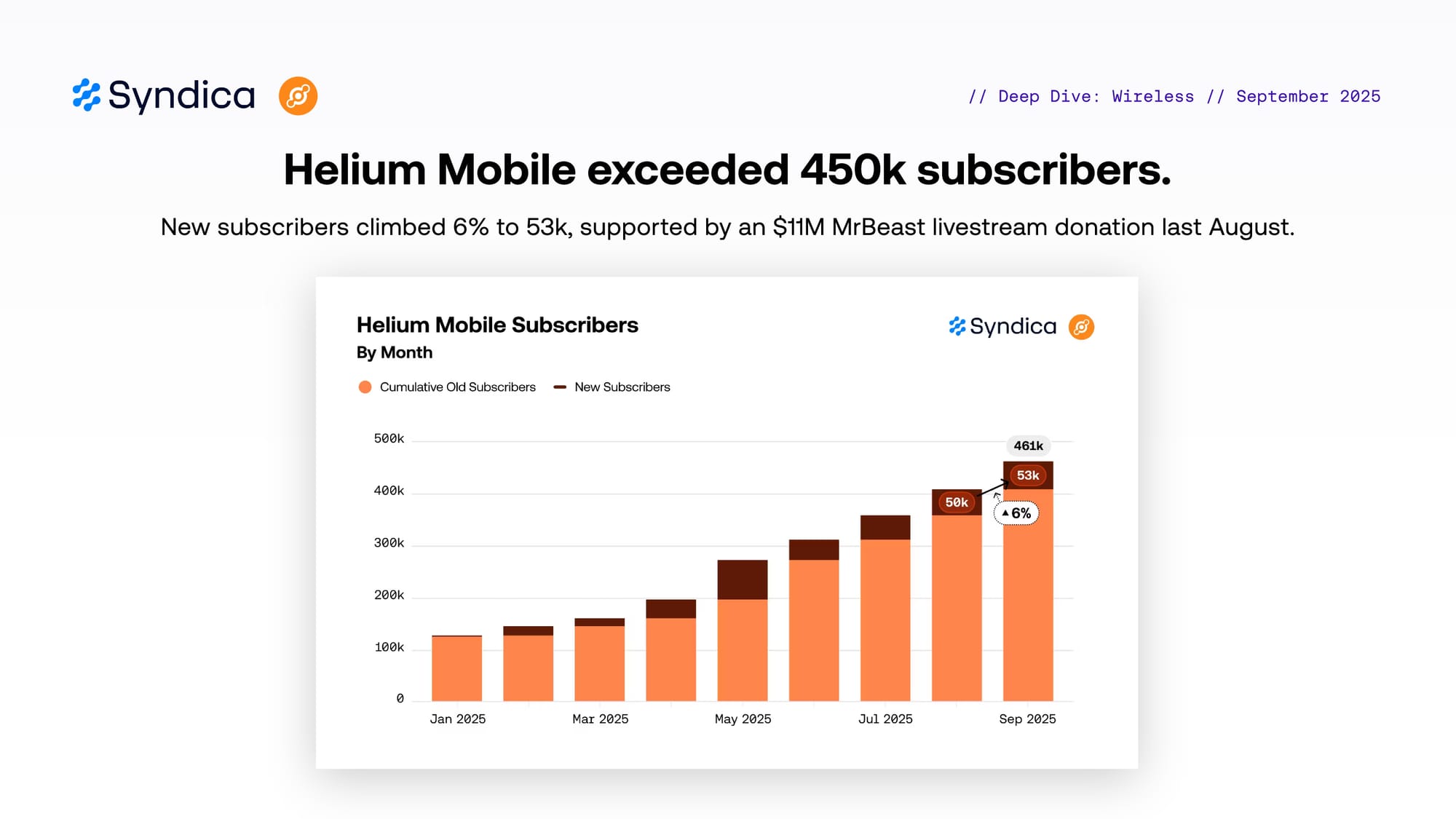 Helium Mobile 的用户超过 45 万。在新用户的推动下,新增用户增长了 6%,达到 5.3 万,这得益于去年 8 月 MrBeast 直播捐赠的 1100 万美元。