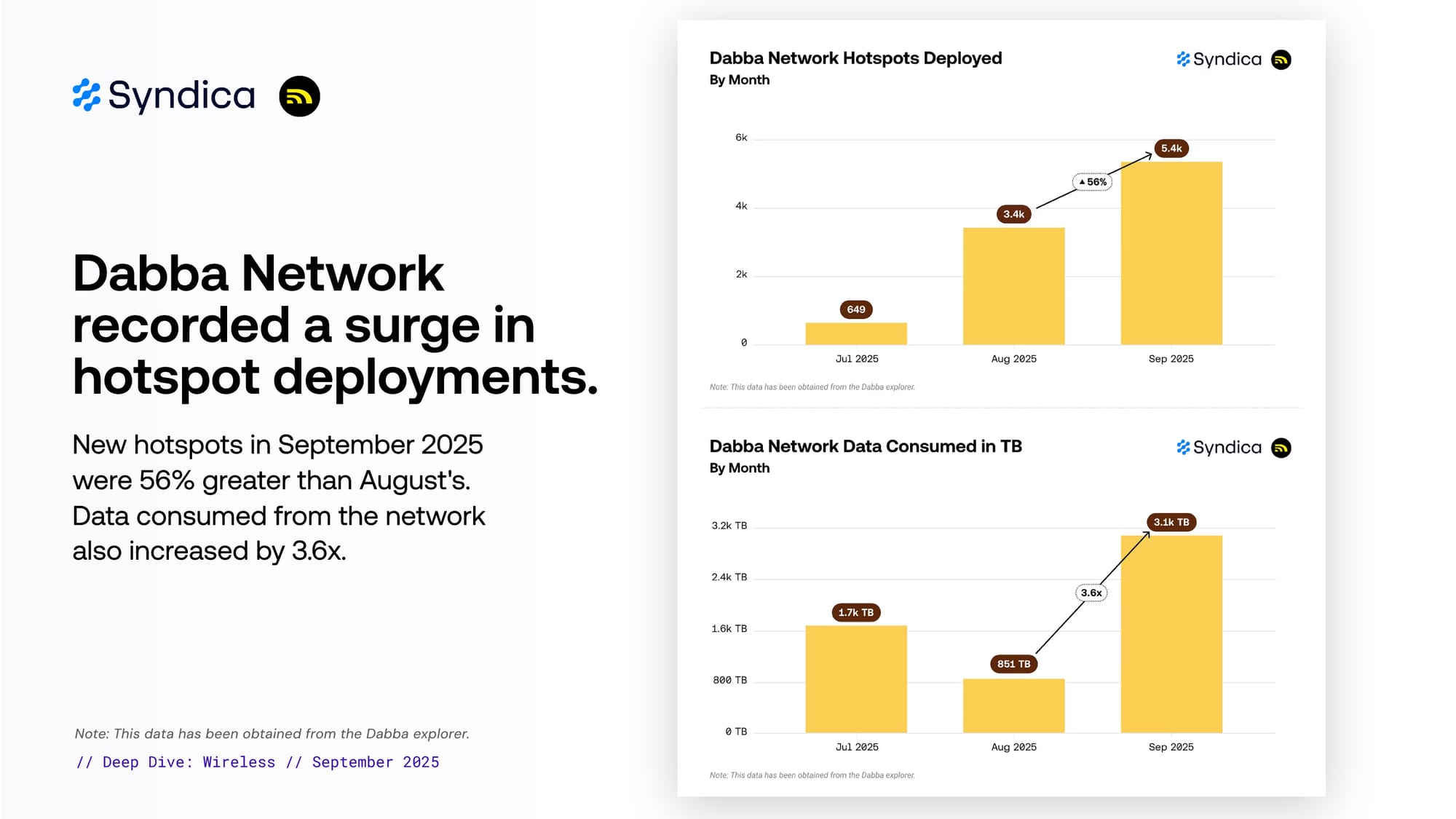 Dabba Network 记录了热点部署的激增。2025 年 9 月的新热点比 8 月份增加了 56%。从网络消耗的数据也增加了 3.6 倍。