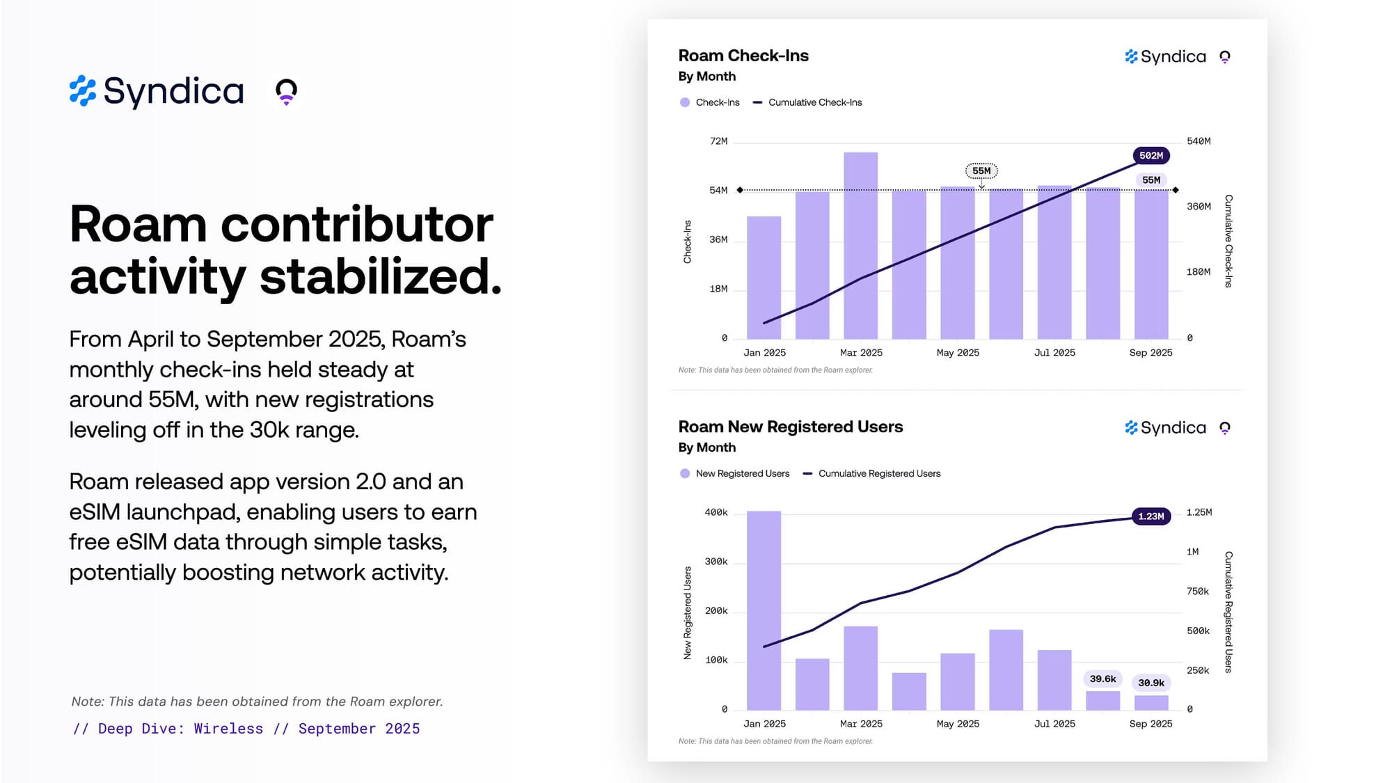 Roam 贡献者的活跃度趋于稳定。从 2025 年 4 月到 9 月,Roam 的每月签到次数稳定在 5500 万次左右,新注册用户稳定在 3 万左右。Roam 发布了 2.0 版本的应用程序和一个 eSIM LaunchPad,使用户可以通过简单的任务赚取免费的 eSIM 数据,从而有可能提高网络活跃度。