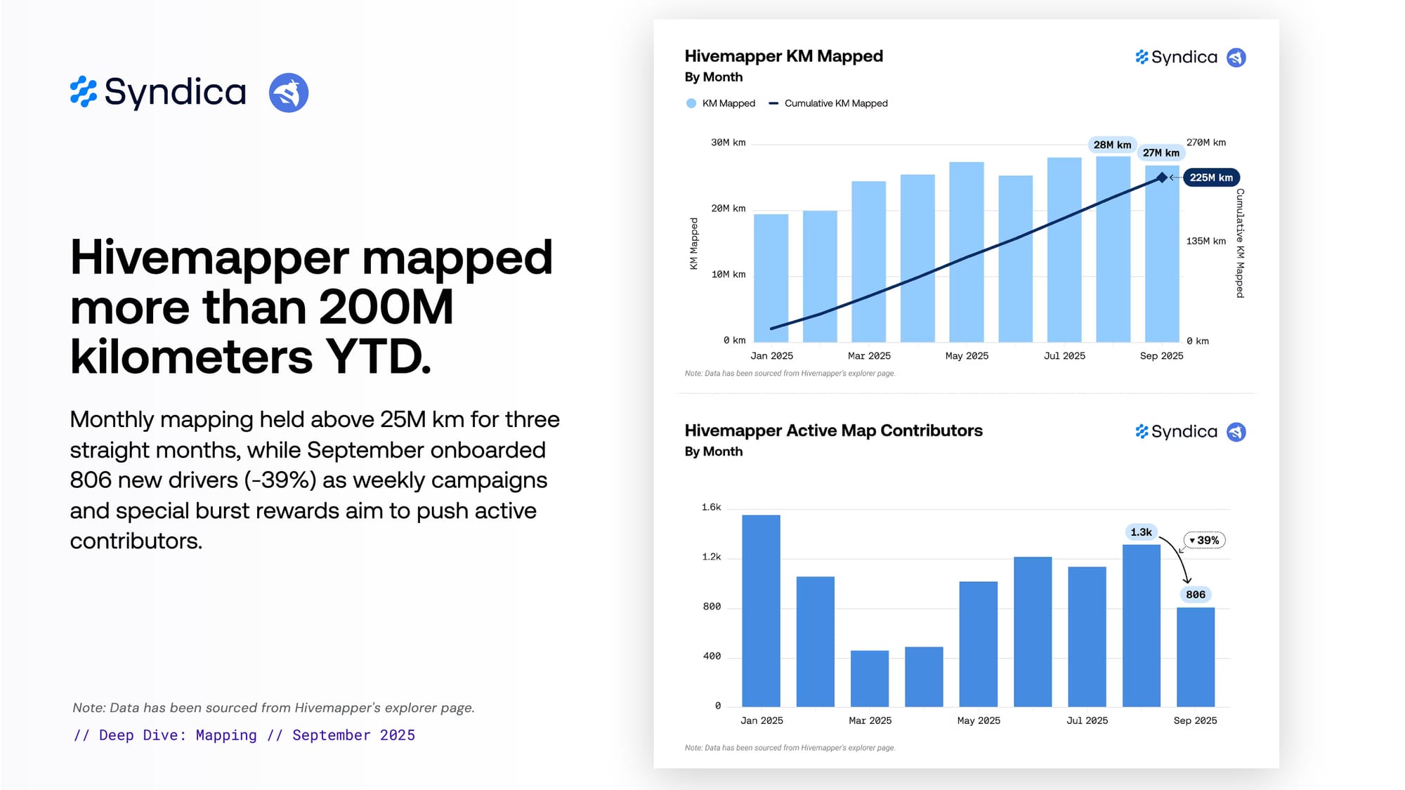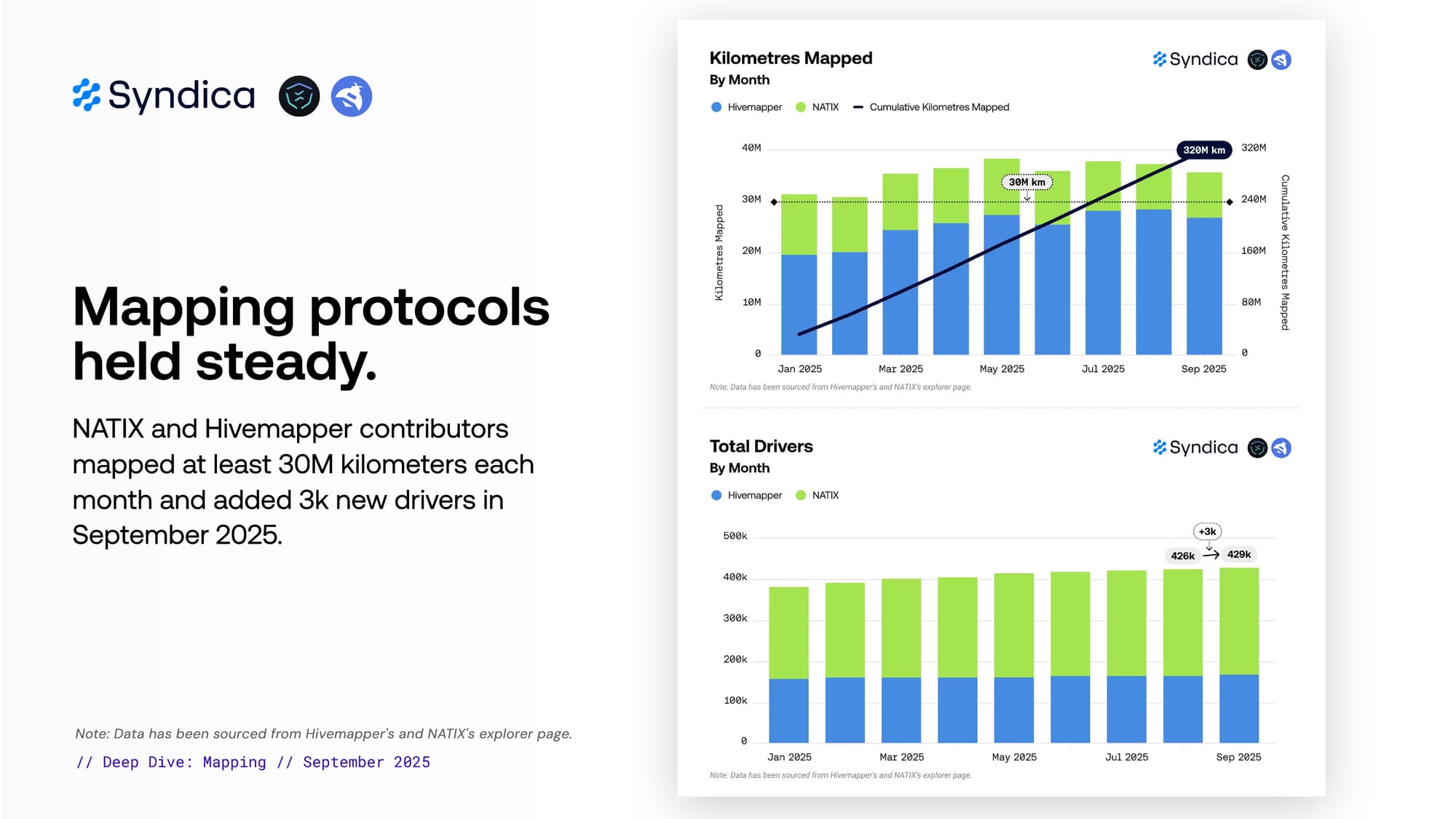 地图绘制协议保持稳定。NATIX 和 Hivemapper 的贡献者每月至少绘制 3000 万公里的地图,并在 2025 年 9 月新增了 3000 名司机。