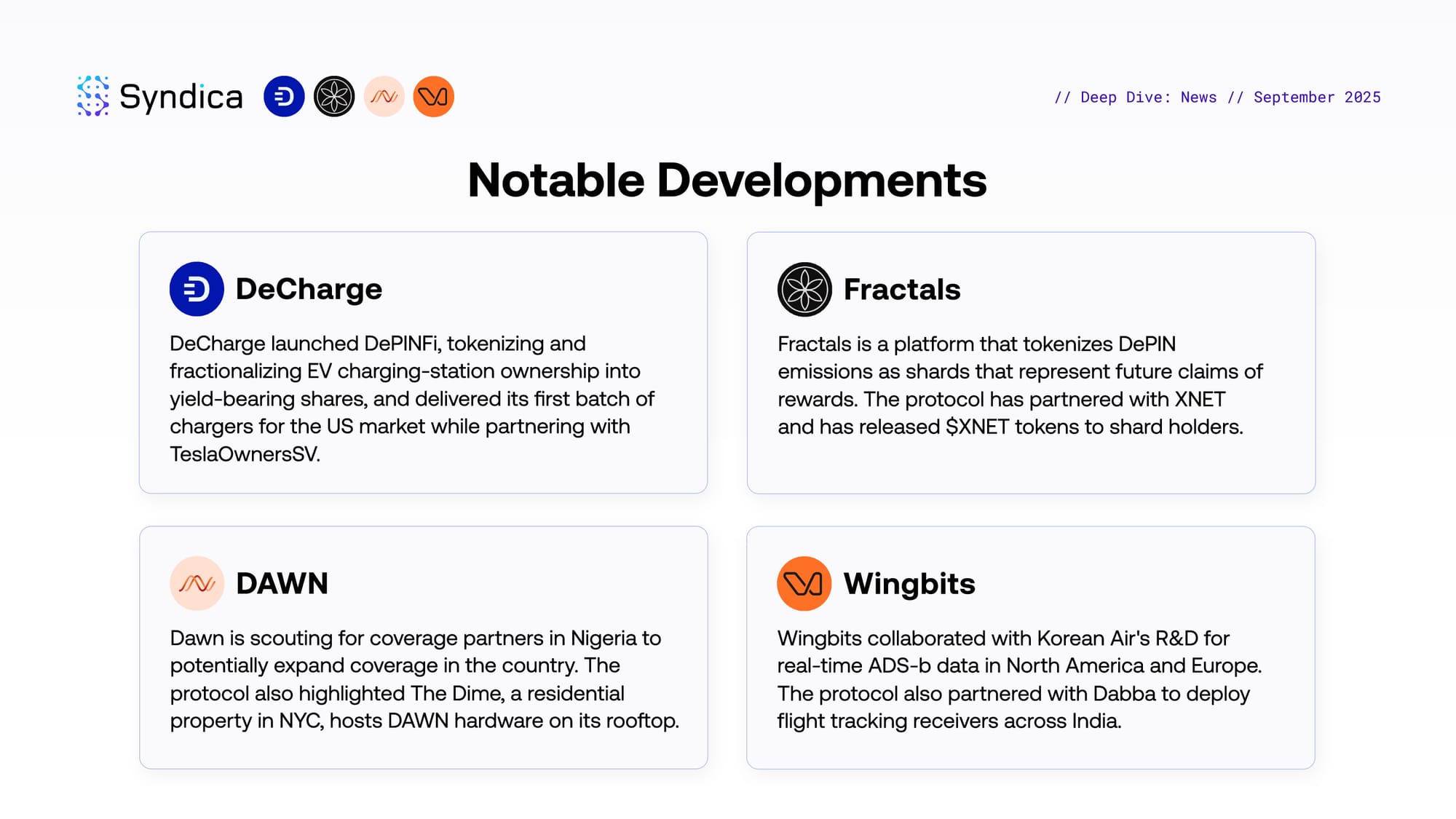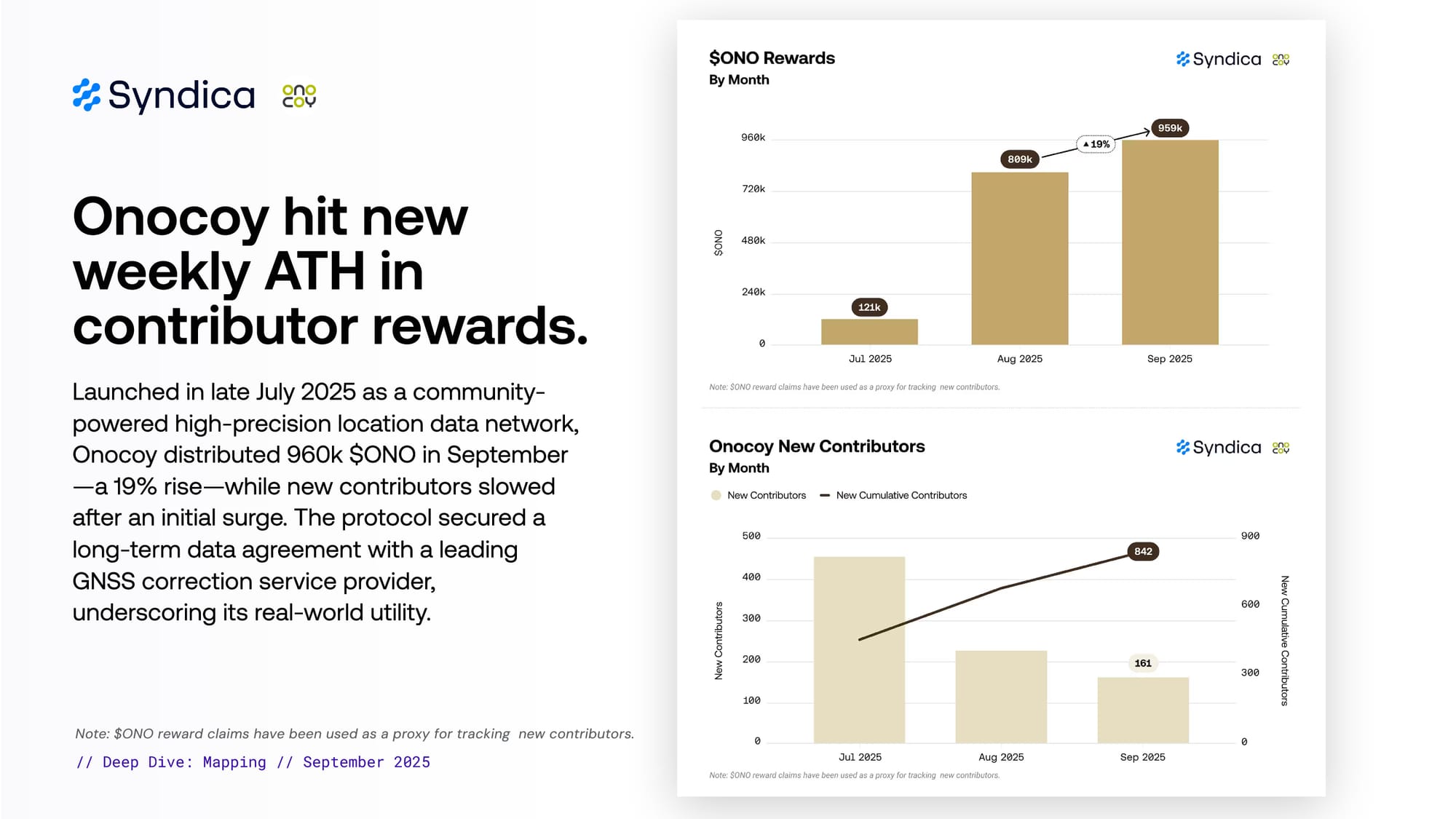 Onocoy 在贡献者奖励方面创下了新的每周历史最高点。Onocoy 于 2025 年 7 月下旬推出,作为一个由社区驱动的高精度位置数据网络,在 9 月份分发了 96 万 $ONO——增长了 19%——而新增贡献者在最初的激增后有所放缓。该协议与一家领先的 GNSS 校正服务提供商达成了一项长期数据协议,突显了其在现实世界中的实用性。