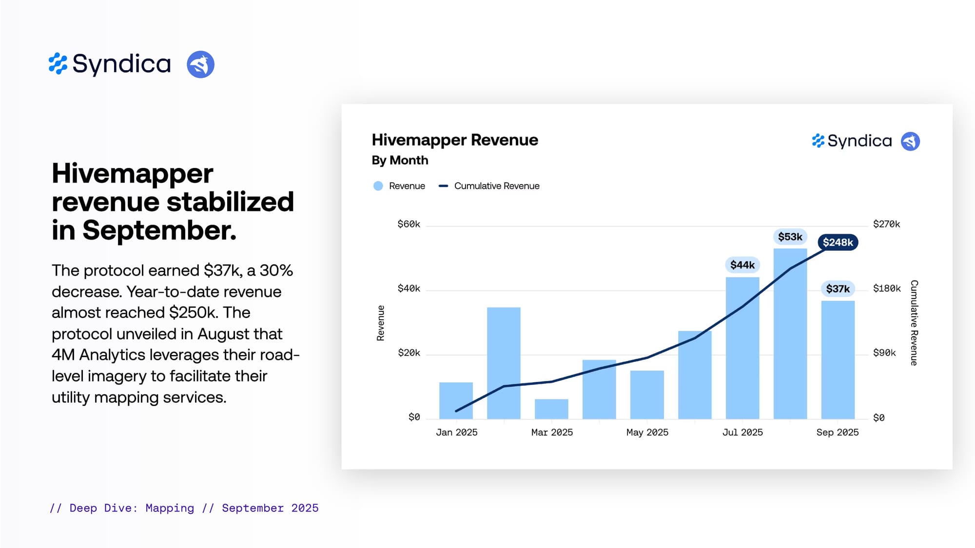 Hivemapper 的收入在 9 月份趋于稳定。该协议赚取了 3.7 万美元,下降了 30%。年初至今的收入几乎达到了 25 万美元。该协议在 8 月份透露,4M Analytics 利用他们的道路级图像来促进他们的实用地图服务。