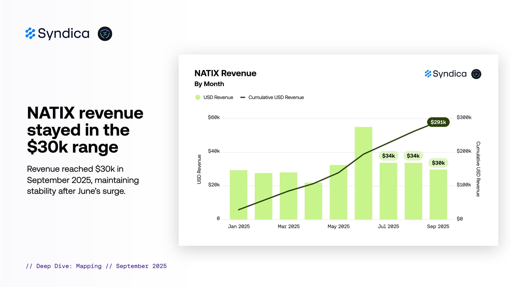 NATIX 的收入保持在 3 万美元左右。2025 年 9 月的收入达到了 3 万美元,在 6 月份的激增后保持了稳定。