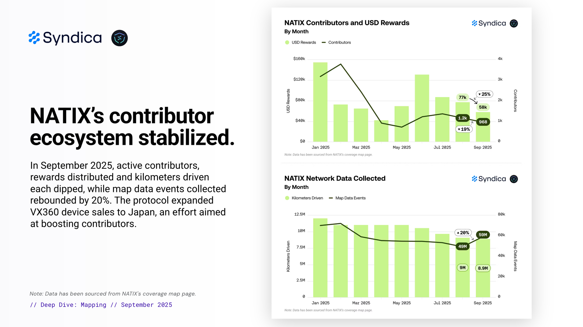 NATIX 的贡献者生态系统趋于稳定。在 2025 年 9 月,活跃贡献者、分发的奖励和行驶的公里数均有所下降,而收集的地图数据事件反弹了 20%。该协议将 VX360 设备的销售扩展到日本,旨在增加贡献者。
