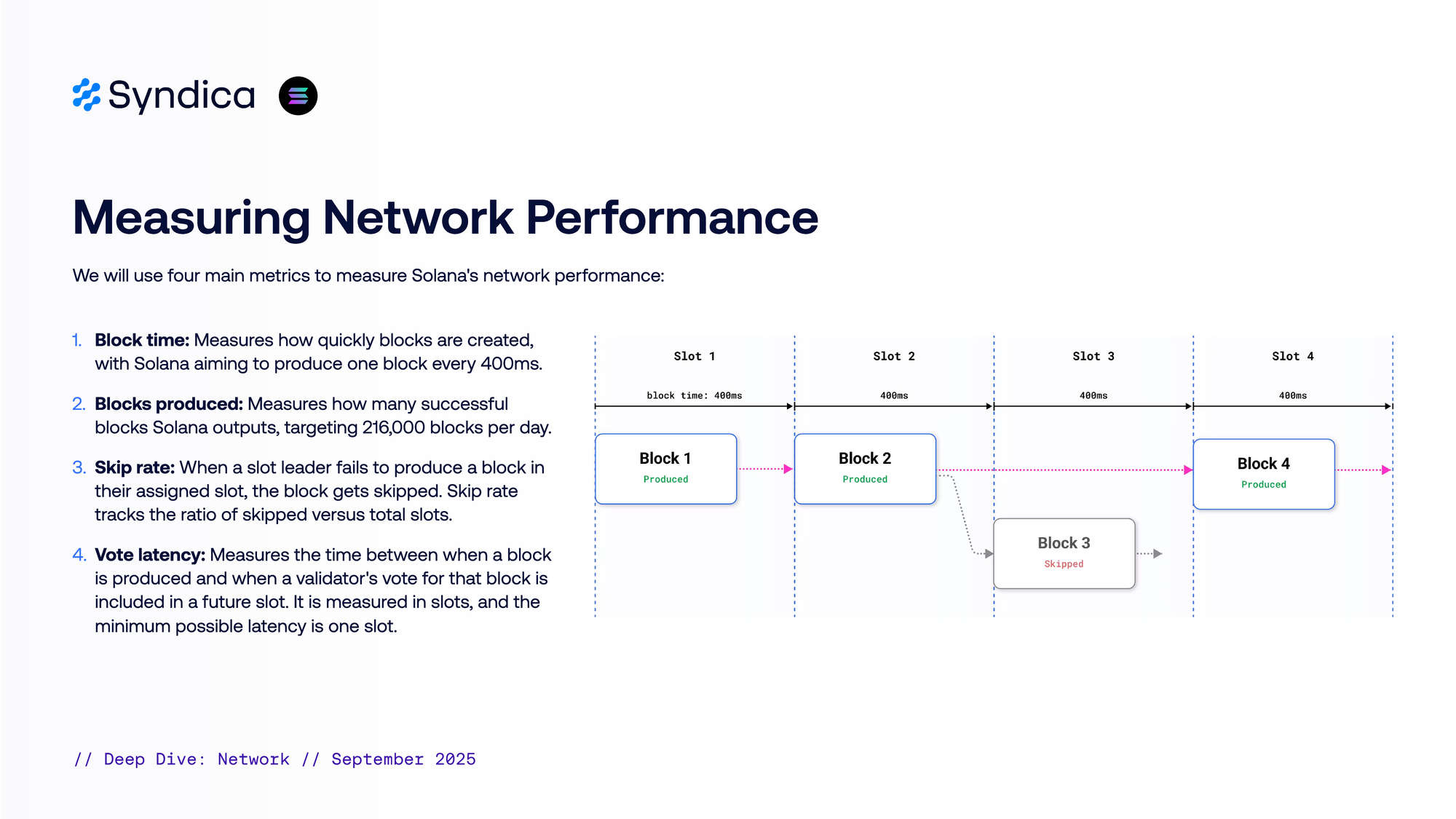 1. 区块时间(Block time): 衡量区块的创建速度,Solana 的目标是每 400 毫秒生成一个区块。