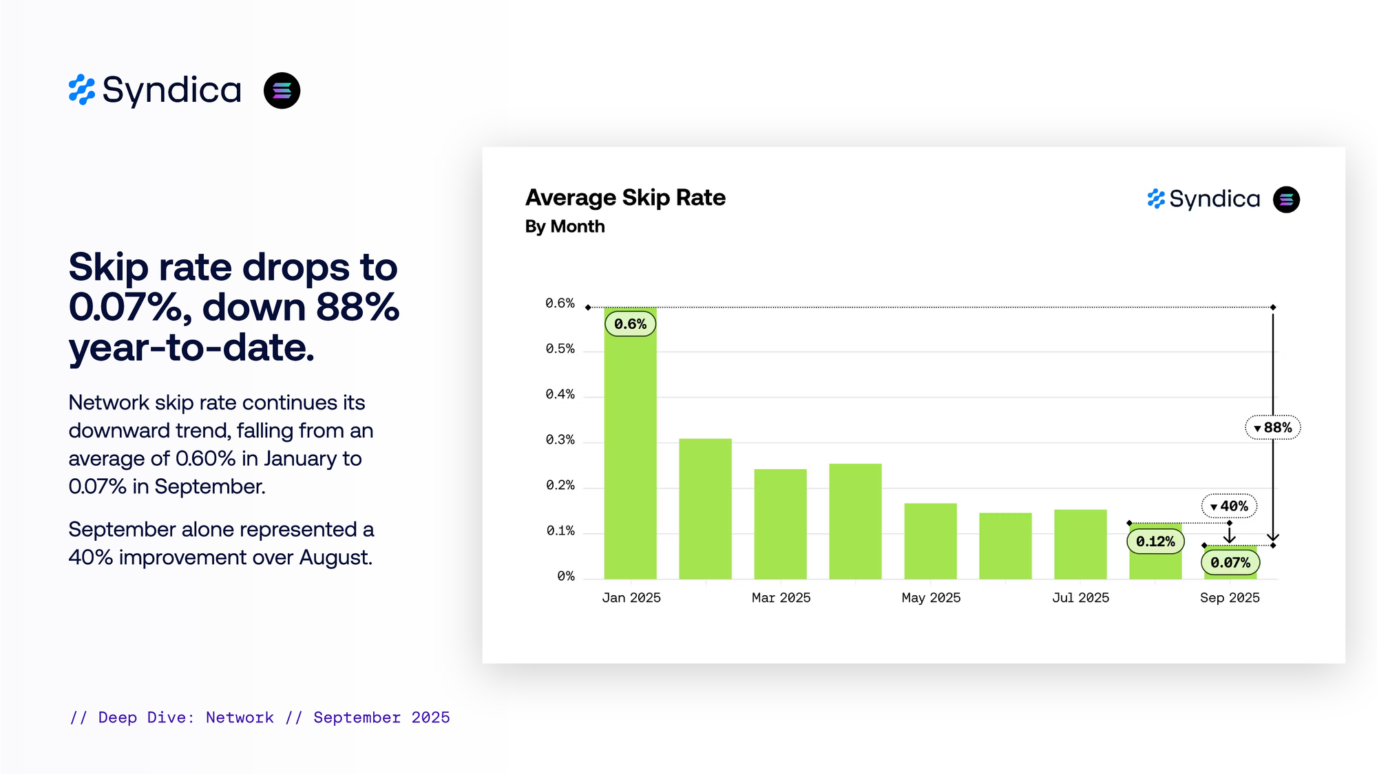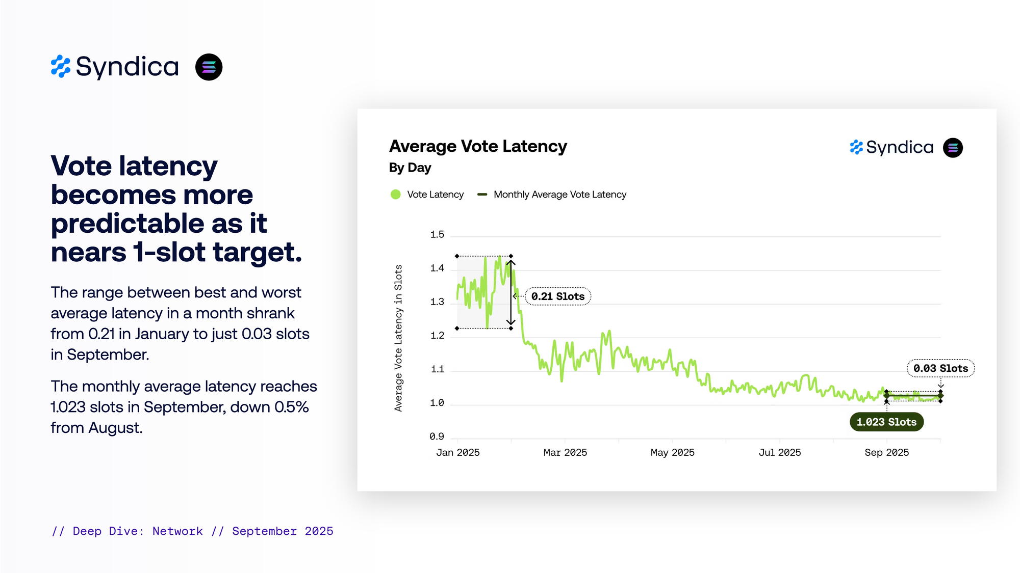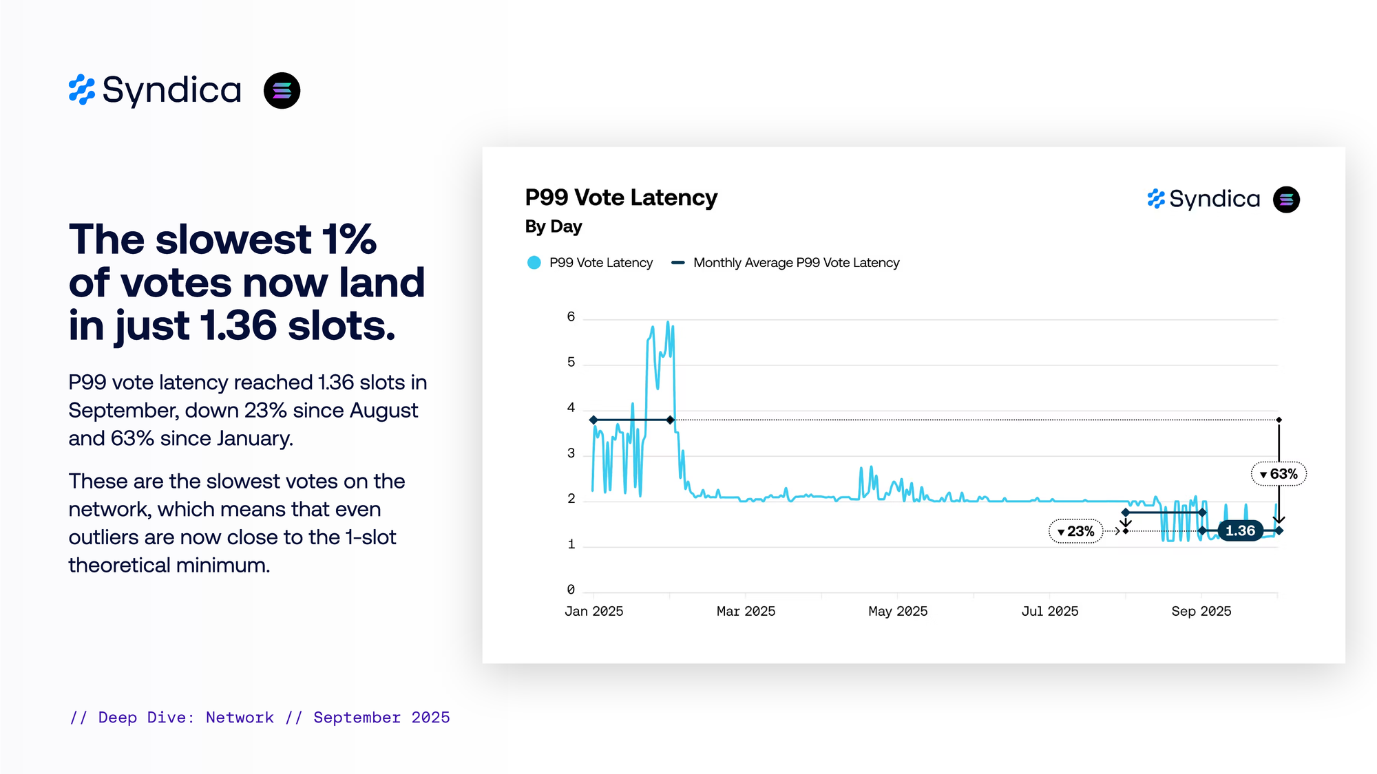 最慢的 1% 的投票现在仅需 1.36 个插槽即可完成。P99 投票延迟在 9 月份达到 1.36 个插槽,比 8 月份下降 23%,比 1 月份下降 63%。这些是网络上最慢的投票,这意味着即使是异常值现在也接近 1 个插槽的理论最小值。