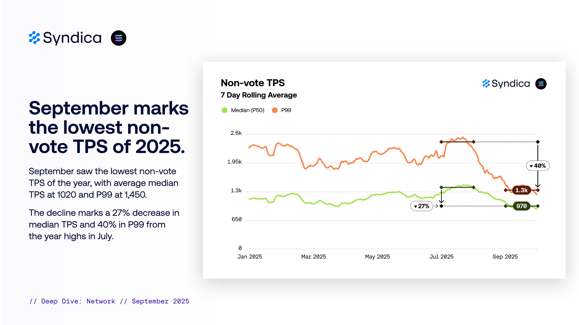 9 月份标志着 2025 年最低的非投票 TPS,7 天滚动中位数为 970,P99 为 1,300。这表示中位数 TPS 下降 27%,P99 比 7 月份的峰值下降 40%。