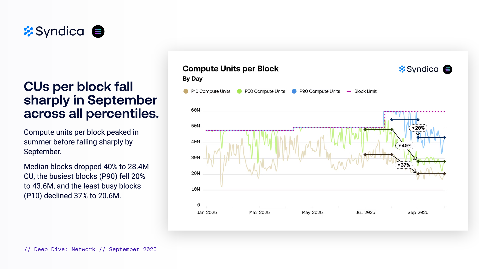 9 月份每个区块的 CU 在所有百分位数中急剧下降。每个区块的计算单元在夏季达到峰值,然后在 9 月份急剧下降。中位数区块下降 40% 至 2840 万 CU,最繁忙的区块 (P90) 下降 20% 至 4360 万,最不繁忙的区块 (P10) 下降 37% 至 2060 万。