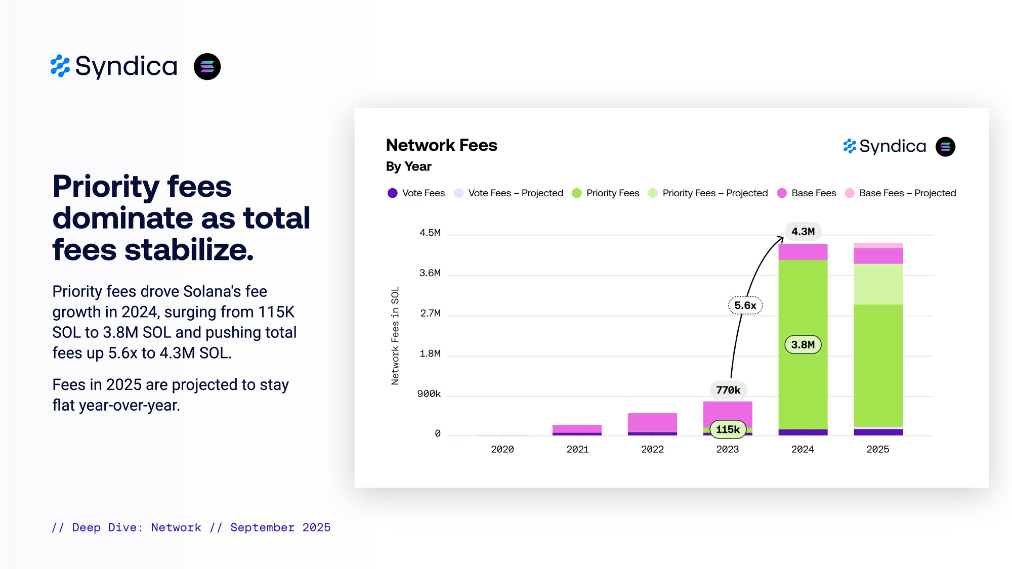 优先级费用占据主导地位,因为总费用趋于稳定。优先级费用推动了 Solana 在 2024 年的费用增长,从 11.5 万 SOL 飙升至 380 万 SOL,并将总费用提高了 5.6 倍至 430 万 SOL。预计 2025 年的费用将与去年持平。