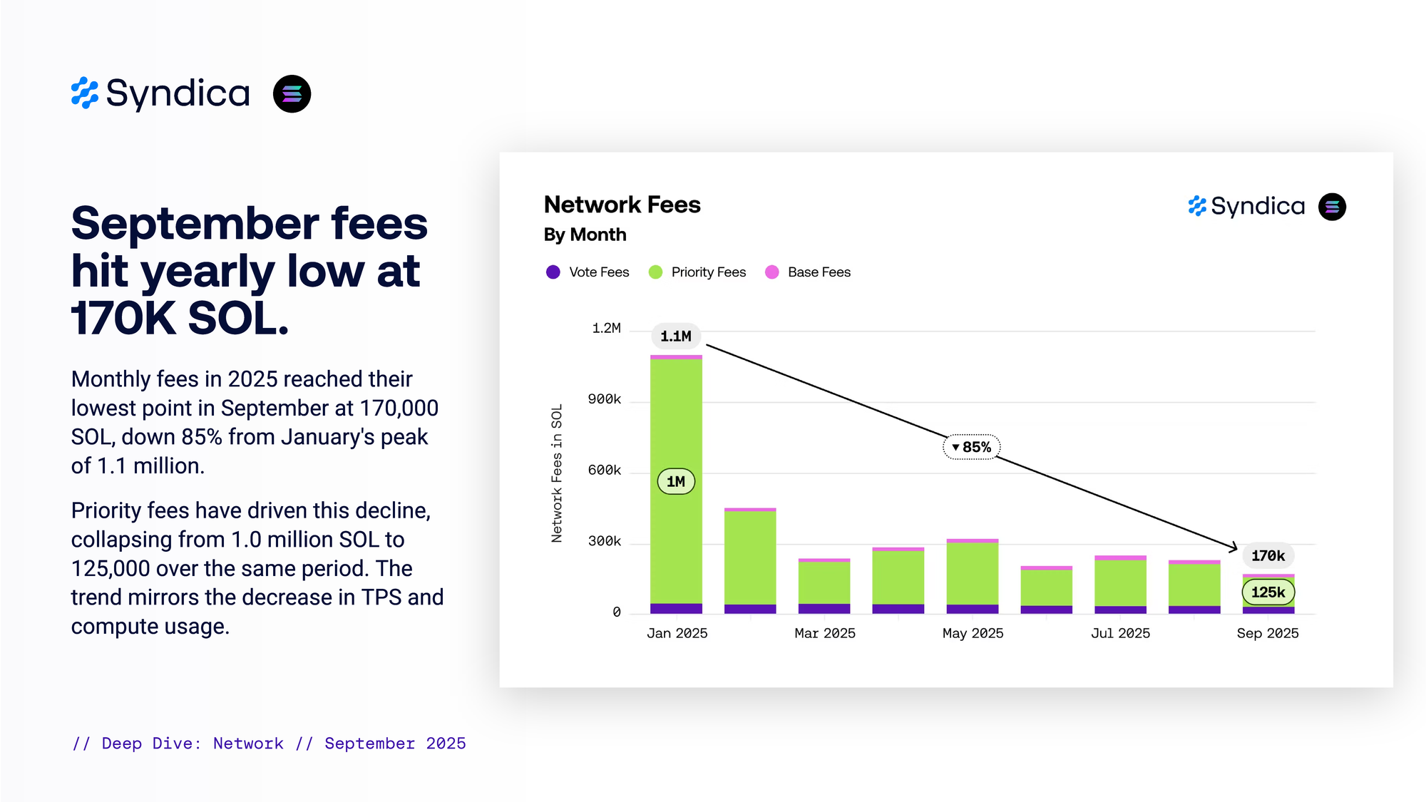 9 月份的费用跌至年度低点,为 17 万 SOL。2025 年的月费用在 9 月份达到最低点,为 170,000 SOL,比 1 月份的峰值 110 万下降了 85%。优先级费用推动了这一下降,从 100 万 SOL 降至同期的 125,000。该趋势反映了 TPS 和计算使用量的下降。