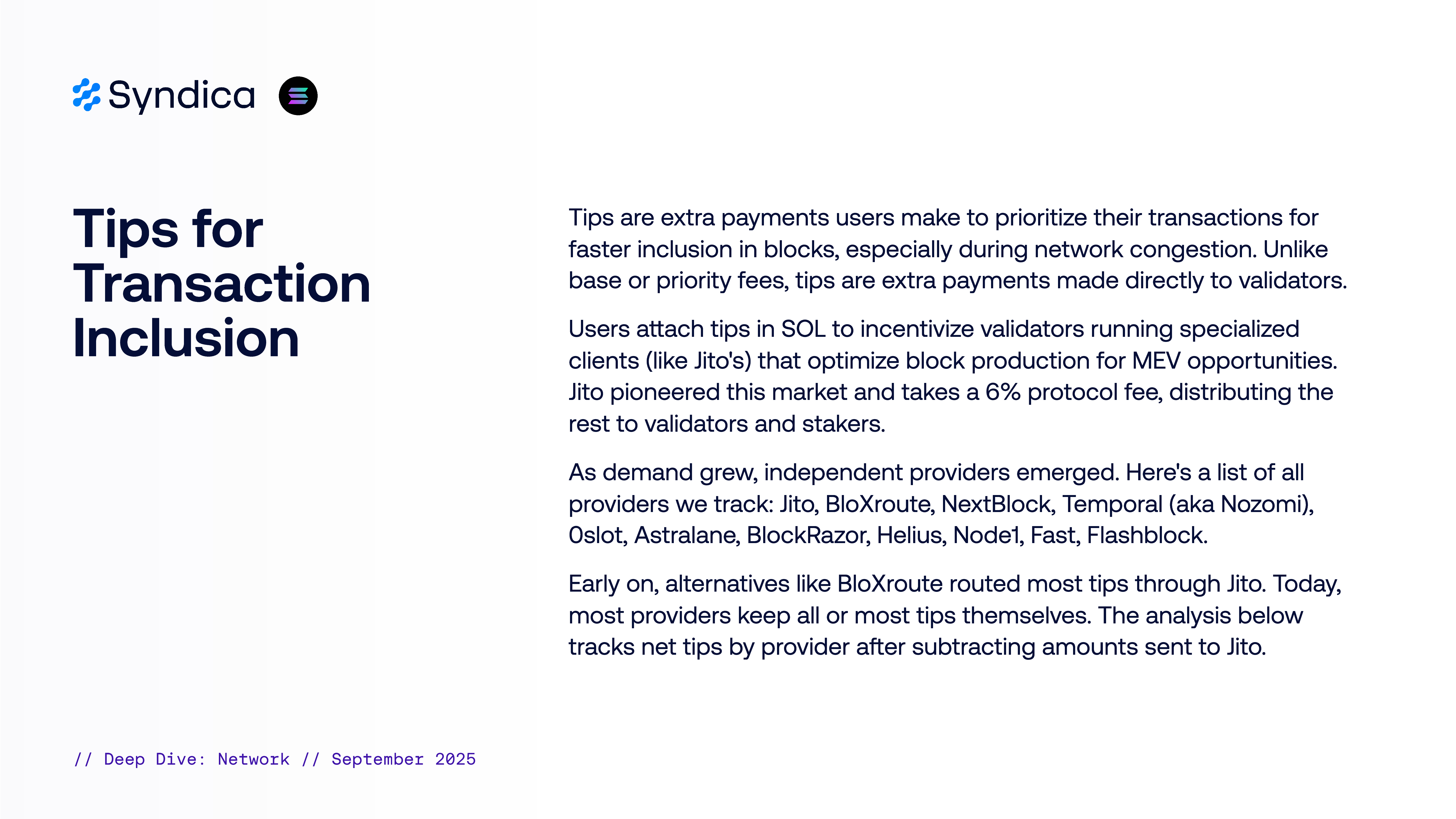 交易包含提示(Tips)提示(Tips)是用户支付的额外费用,用于优先考虑他们的交易,以便更快地包含在区块中,尤其是在网络拥塞期间。与基础费用或优先级费用不同,提示是直接支付给验证者的额外费用。用户将 SOL 中的提示附加到激励验证者运行专用客户端(如 Jito 的客户端),这些客户端优化区块生产以获得 MEV 机会。Jito 开创了这个市场,并收取 6% 的协议费用,其余的分配给验证者和质押者。随着需求的增长,独立的提供商出现了。以下是我们跟踪的所有提供商的列表:Jito、BloXroute、NextBlock、Temporal(又名 Nozomi)、0slot、Astralane、BlockRazor、Helius、Node1、Fast、Flashblock。早期,BloXroute 等替代方案将大部分提示通过 Jito 路由。今天,大多数提供商保留全部或大部分提示。以下分析跟踪了提供商的净提示,减去发送给 Jito 的金额。