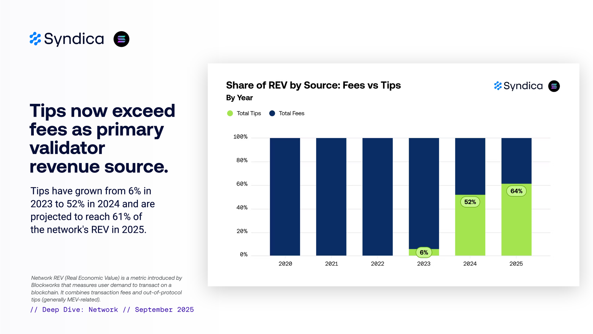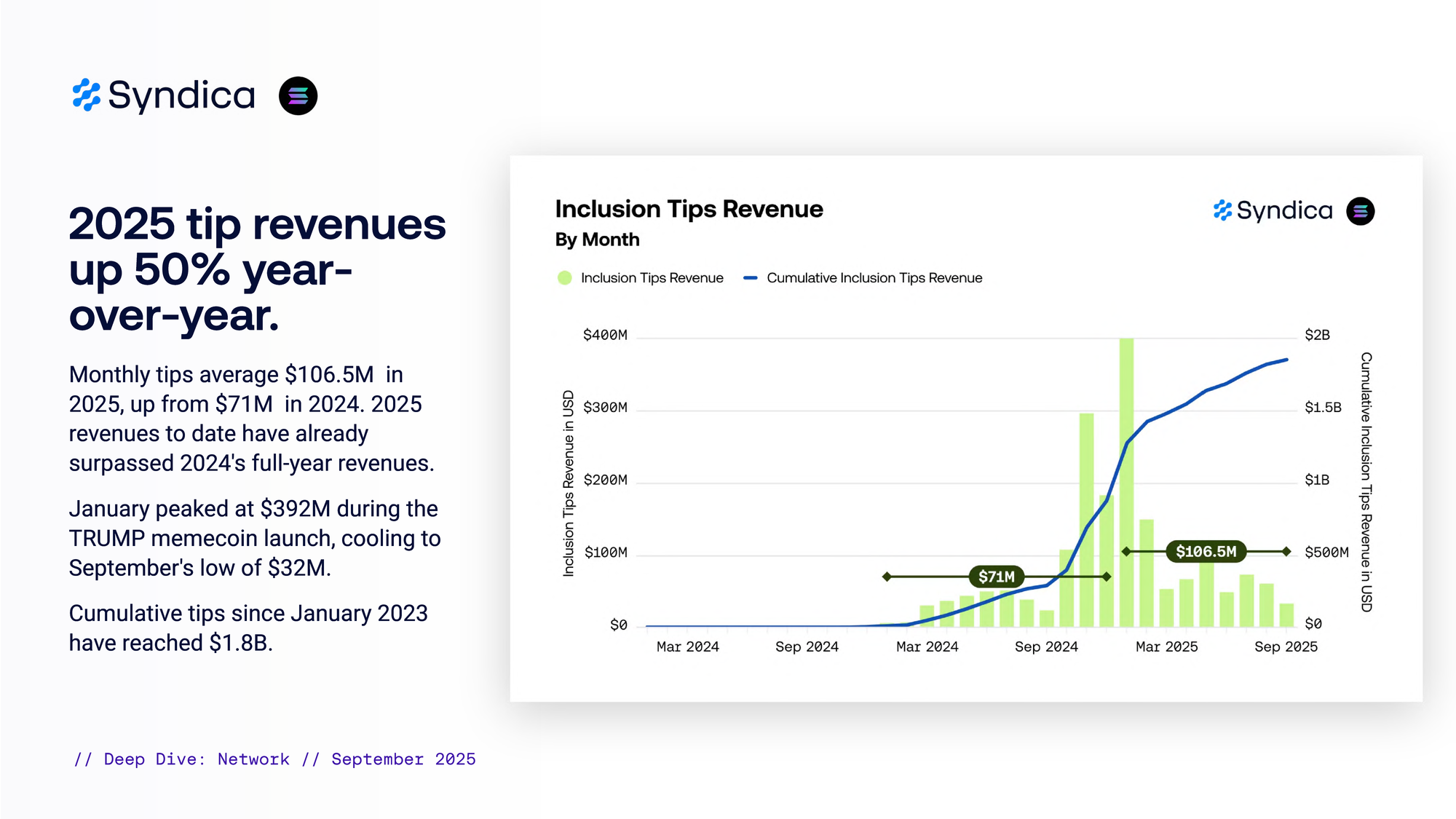 提示现在超过费用,成为验证者的主要收入来源。提示从 2023 年的 6% 增长到 2024 年的 52%,预计在 2025 年将达到网络 REV 的 61%。2025 年的提示收入同比增长 50%。2025 年的月平均提示为 1.065 亿美元,高于 2024 年的 7100 万美元。迄今为止,2025 年的收入已经超过了 2024 年的全年收入。1 月份在 TRUMP memecoin 发布期间达到峰值 3.92 亿美元,降温至 9 月份的低点 3200 万美元。自 2023 年 1 月以来,累计提示已达到 18 亿美元。