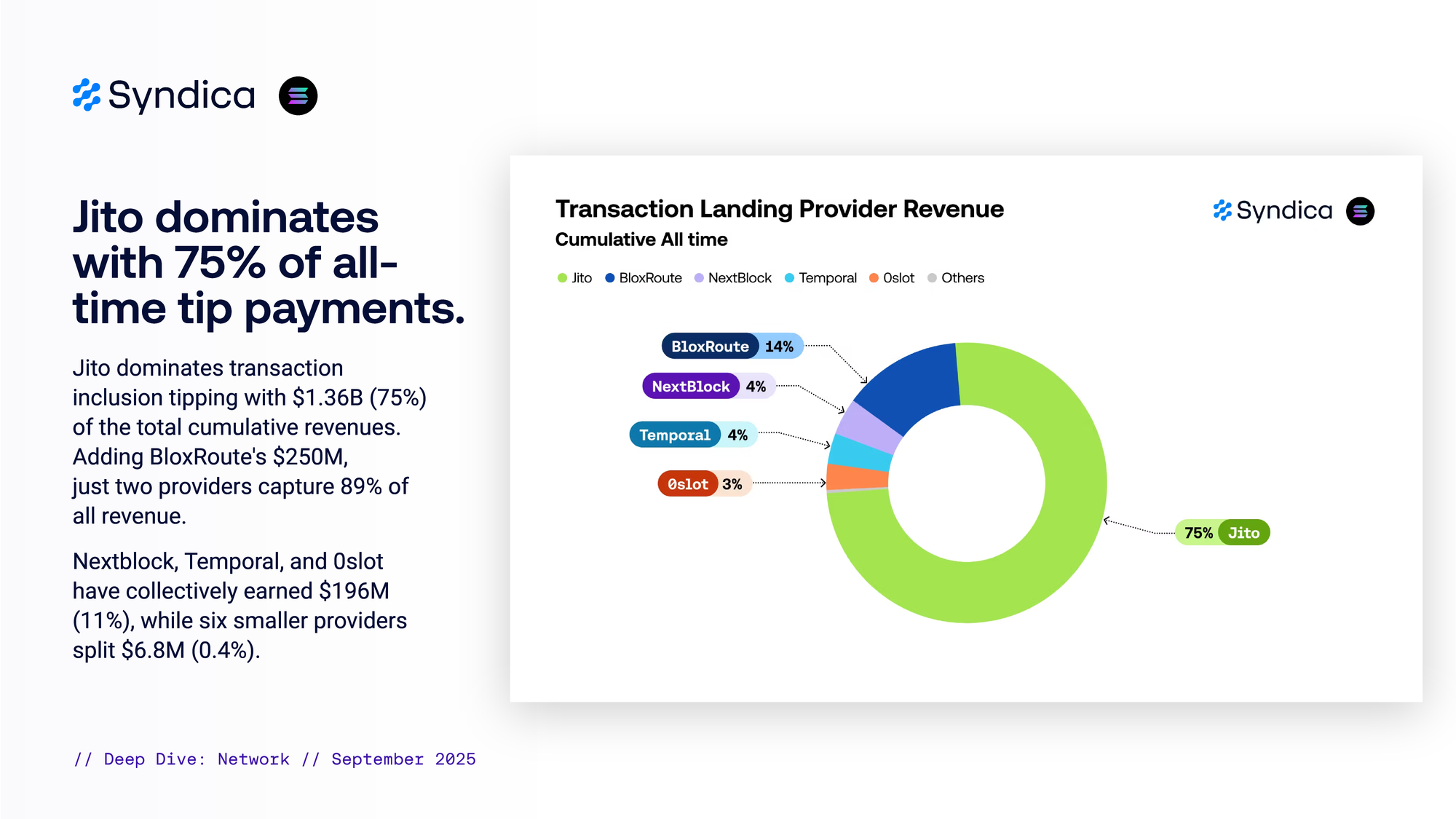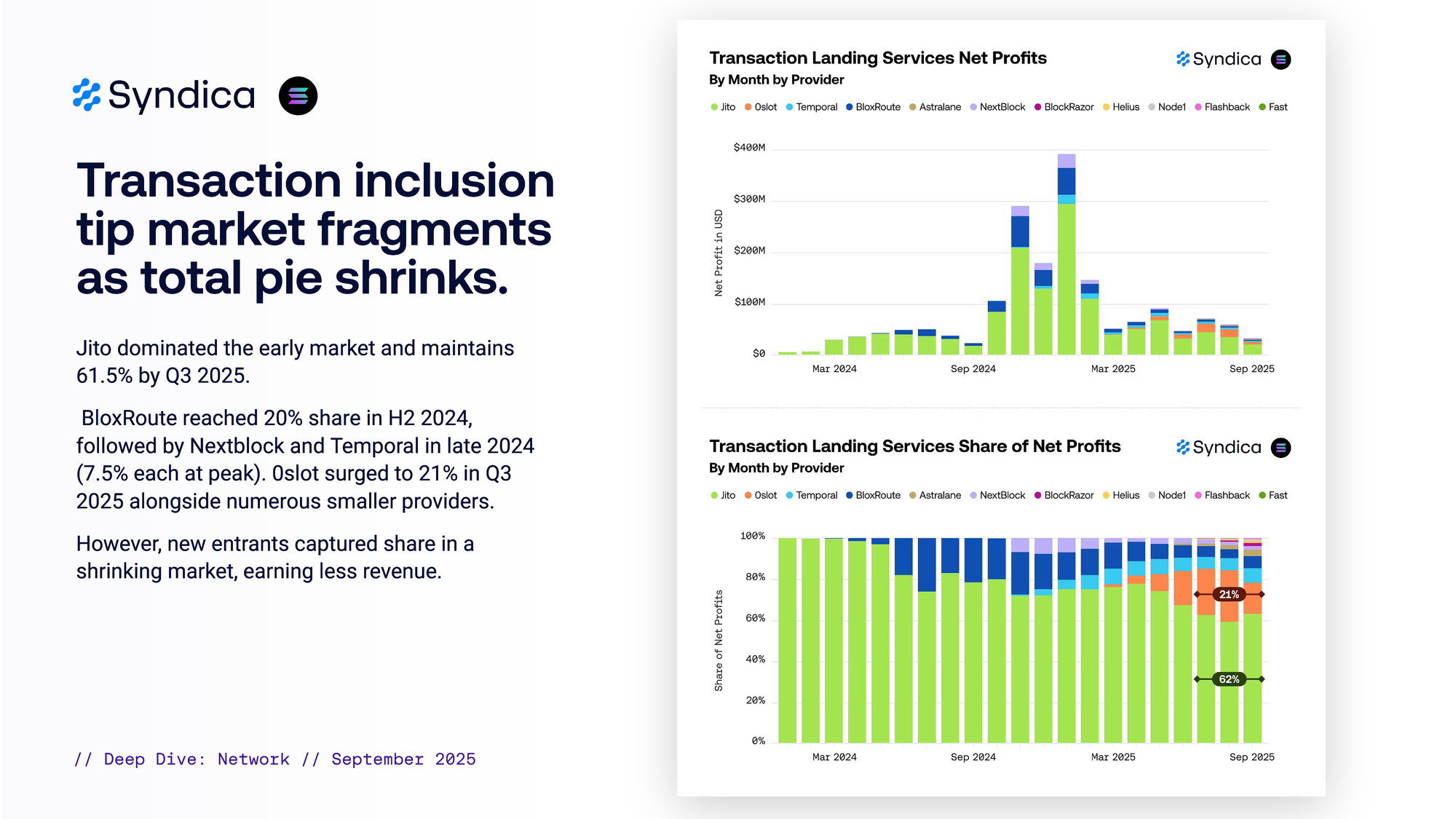 随着总蛋糕的缩小,交易包含提示市场变得分散。Jito 在早期市场占据主导地位,并在 2025 年第三季度保持 61.5% 的份额。BloxRoute 在 2024 年下半年达到 20% 的份额,其次是 Nextblock 和 Temporal 在 2024 年末(峰值时各占 7.5%)。0slot 在 2025 年第三季度飙升至 21%,同时出现了许多较小的提供商。然而,新的进入者在一个萎缩的市场中获得了份额,收入减少。