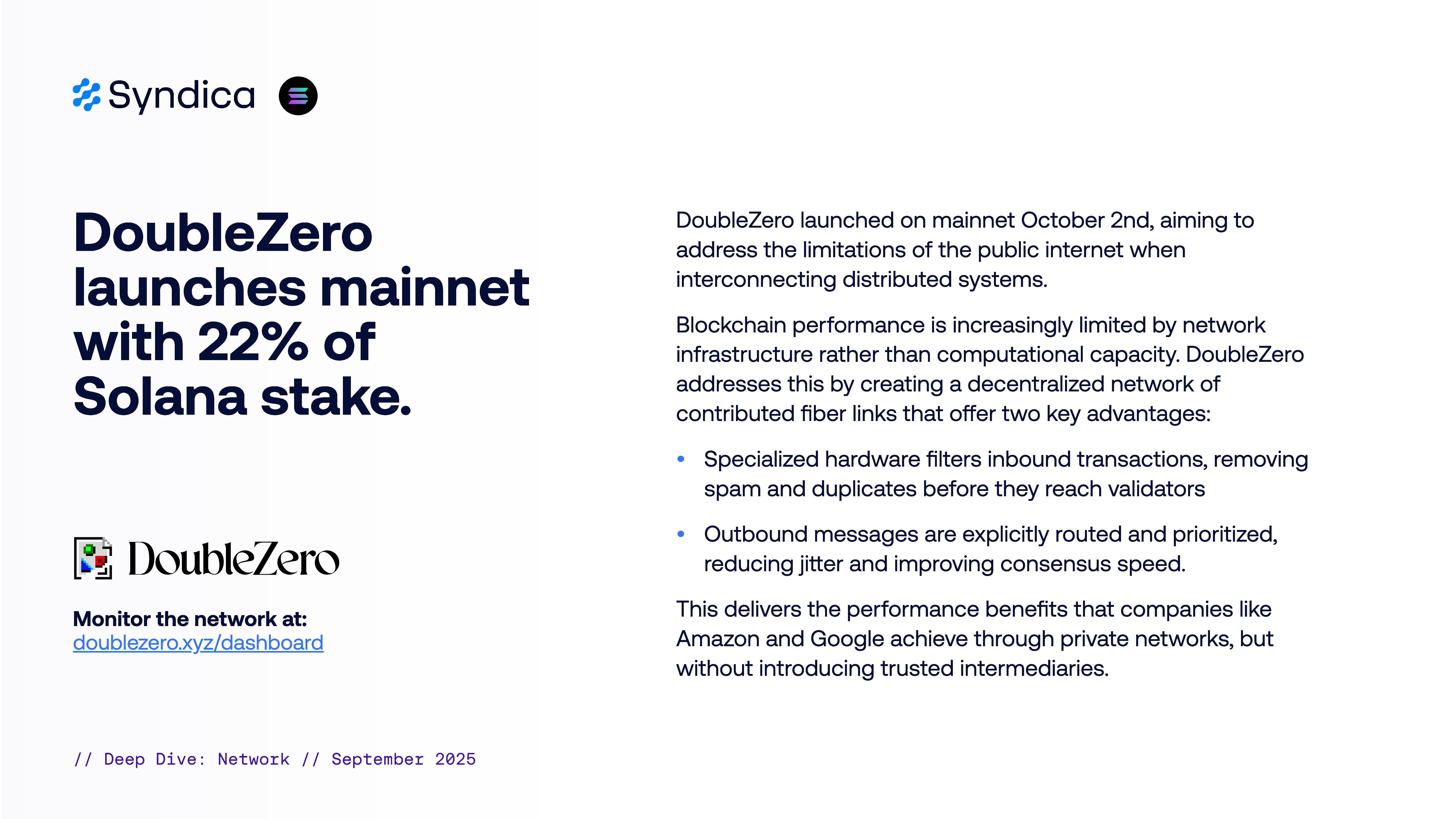 DoubleZero 推出主网,拥有 22% 的 Solana 质押。DoubleZero 于 10 月 2 日在主网上推出,旨在解决公共互联网在互连分布式系统时的局限性。
