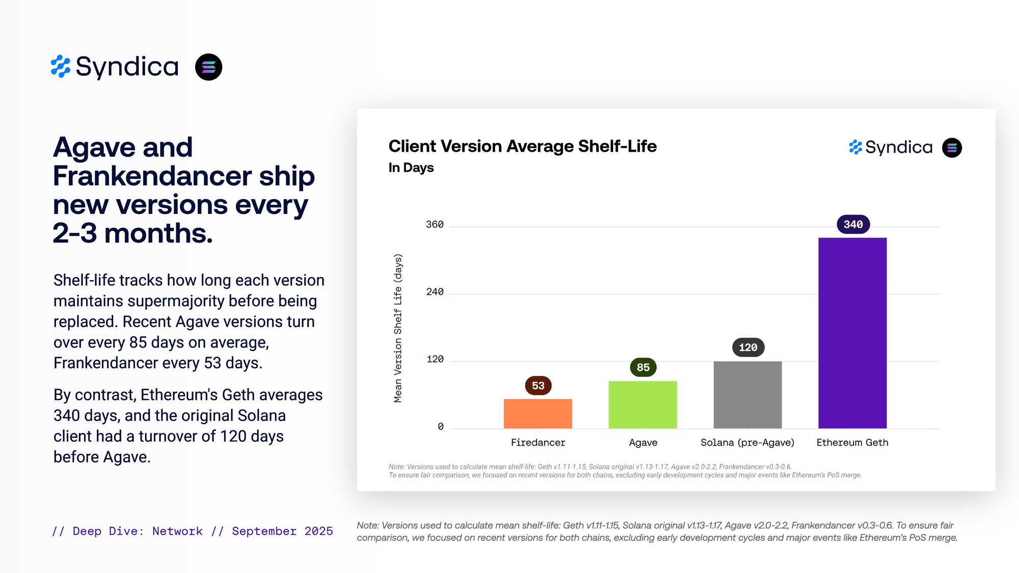 Agave 和 Frankendancer 每 2-3 个月发布新版本。Shelf-life 跟踪每个版本在被替换之前保持超多数的时间。最近的 Agave 版本平均每 85 天更新一次,Frankendancer 每 53 天更新一次。