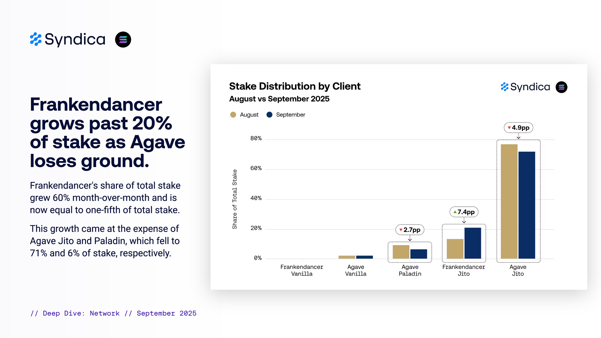 随着 Agave 失势,Frankendancer 的质押份额超过 20%。Frankendancer 在总质押中的份额环比增长 60%,现在等于总质押的五分之一。这种增长是以 Agave Jito 和 Paladin 为代价的,它们的质押份额分别降至 71% 和 6%。