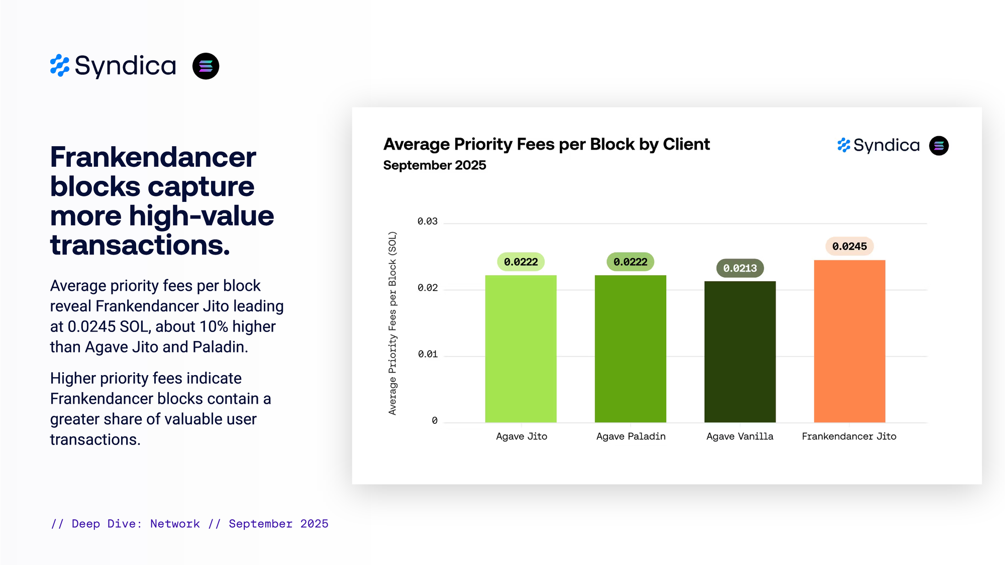 Frankendancer 区块捕获更多高价值交易。每个区块的平均优先级费用显示,Frankendancer Jito 以 0.0245 SOL 领先,比 Agave Jito 和 Paladin 高约 10%。