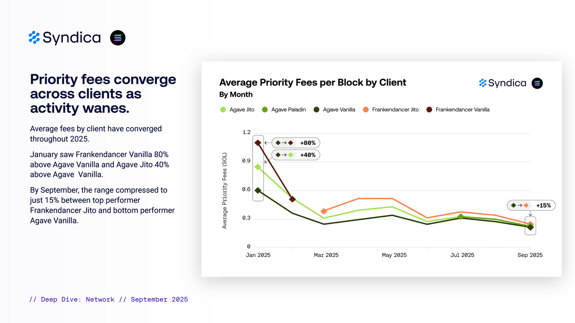 随着活动减弱,优先级费用在客户端之间趋于一致。整个 2025 年,客户端的平均费用趋于一致。