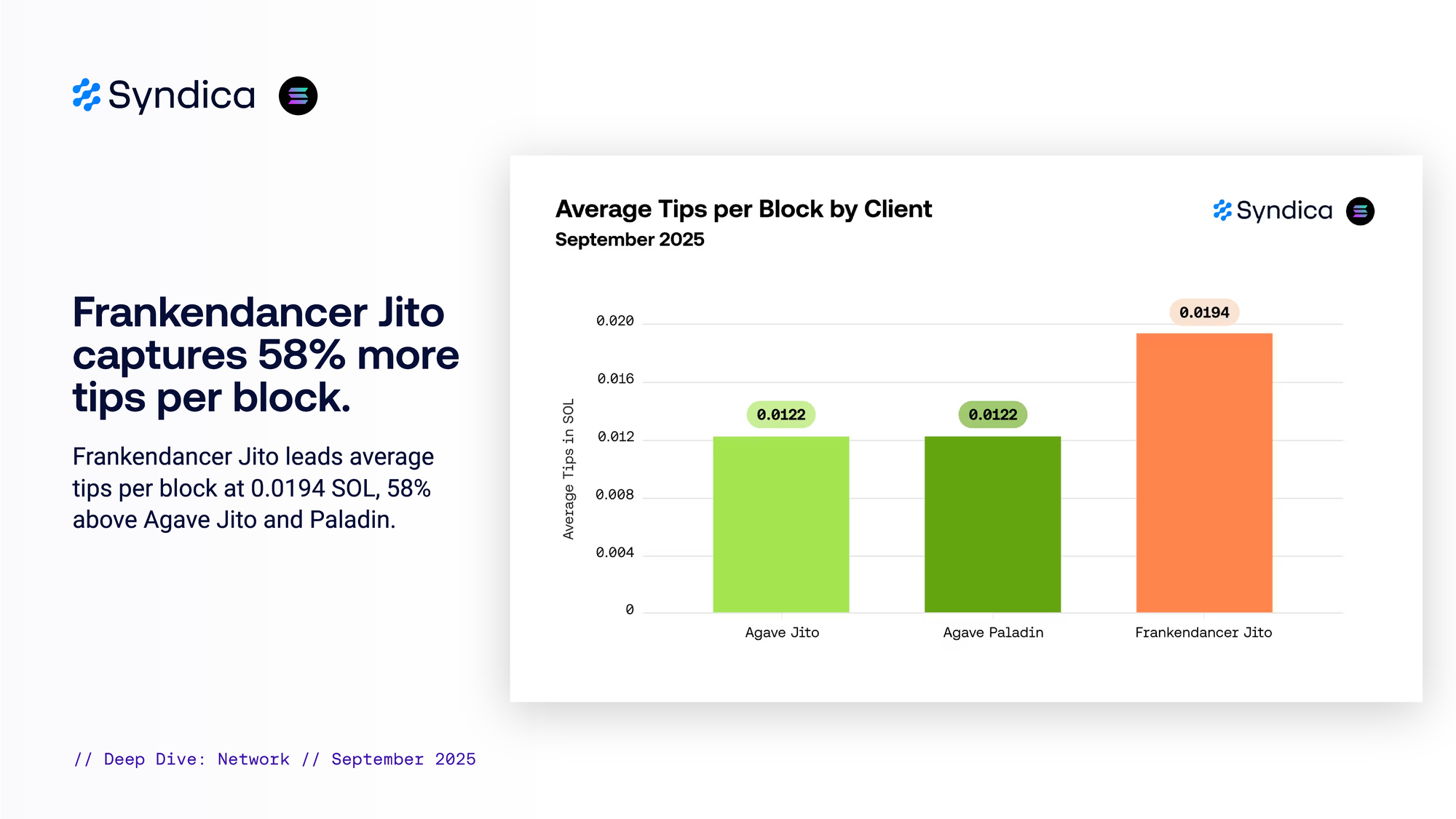 Frankendancer Jito 每个区块捕获的提示多 58%。Frankendancer Jito 以每个区块 0.0194 SOL 的平均提示领先,比 Agave Jito 和 Paladin 高 58%。