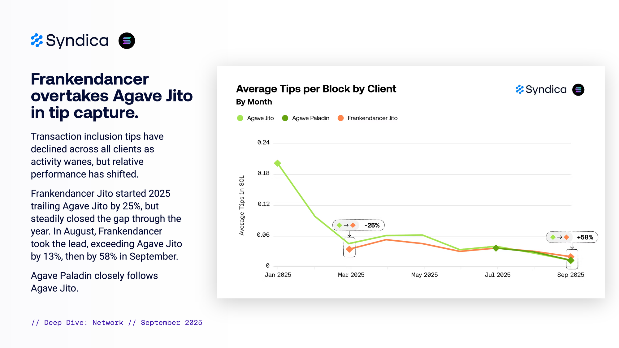 Frankendancer Jito 在 2025 年初落后于 Agave Jito 25%,但全年稳步缩小差距。8 月份,Frankendancer 领先,超过 Agave Jito 13%,然后在 9 月份超过 58%。