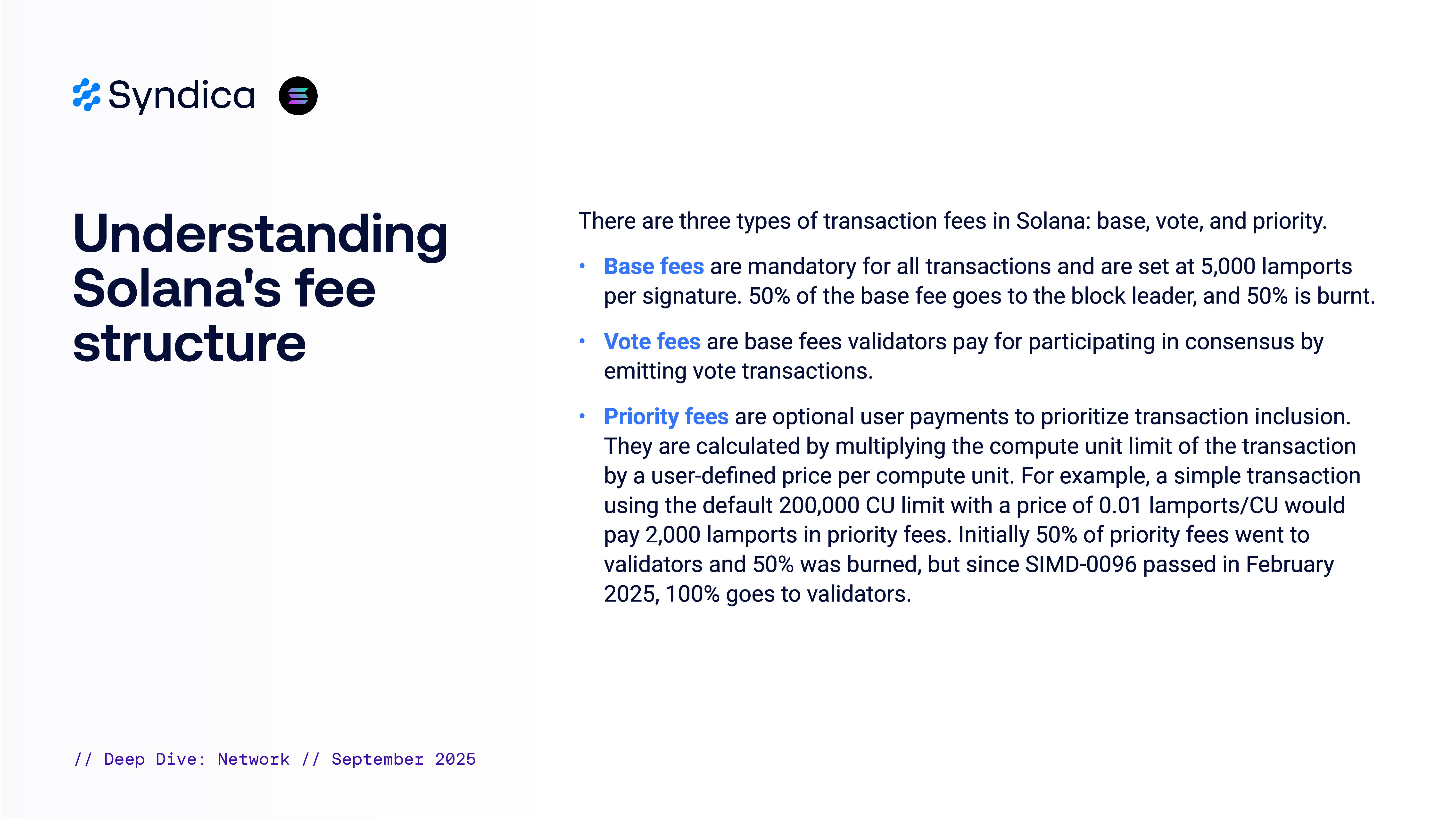 • 优先级费用(Priority fees) 是可选的用户付款,用于优先考虑交易包含。它们的计算方法是将交易的计算单元限制乘以用户定义的每个计算单元的价格。例如,一个简单的交易使用默认的 200,000 CU 限制,价格为 0.01 lamports/CU,将支付 2,000 lamports 的优先级费用。最初,50% 的优先级费用归验证者所有,50% 被烧毁,但自从 SIMD-0096 在 2025 年 2 月通过后,100% 归验证者所有。