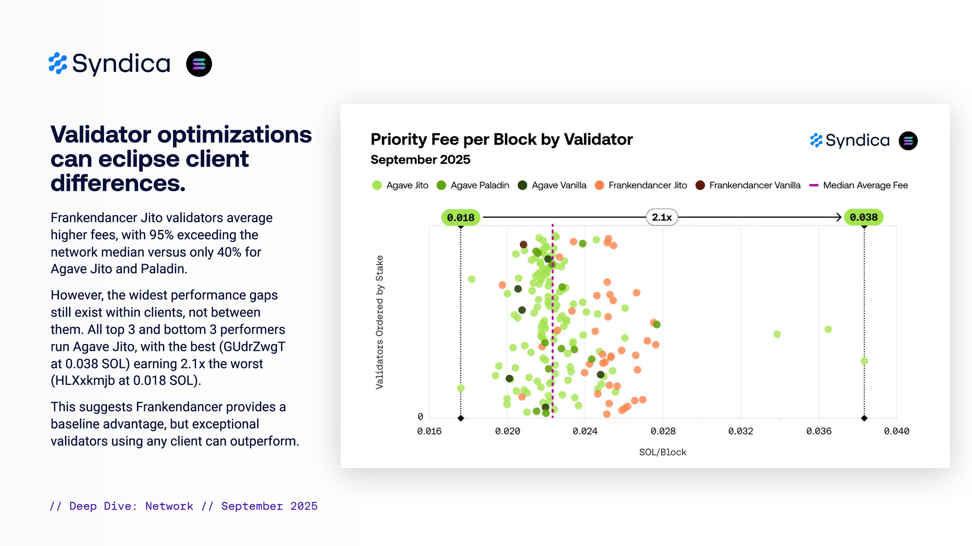 验证者优化可以掩盖客户端差异。 Frankendancer Jito 验证者的平均费用较高,其中 95% 超过网络中位数,而 Agave Jito 和 Paladin 仅为 40%。