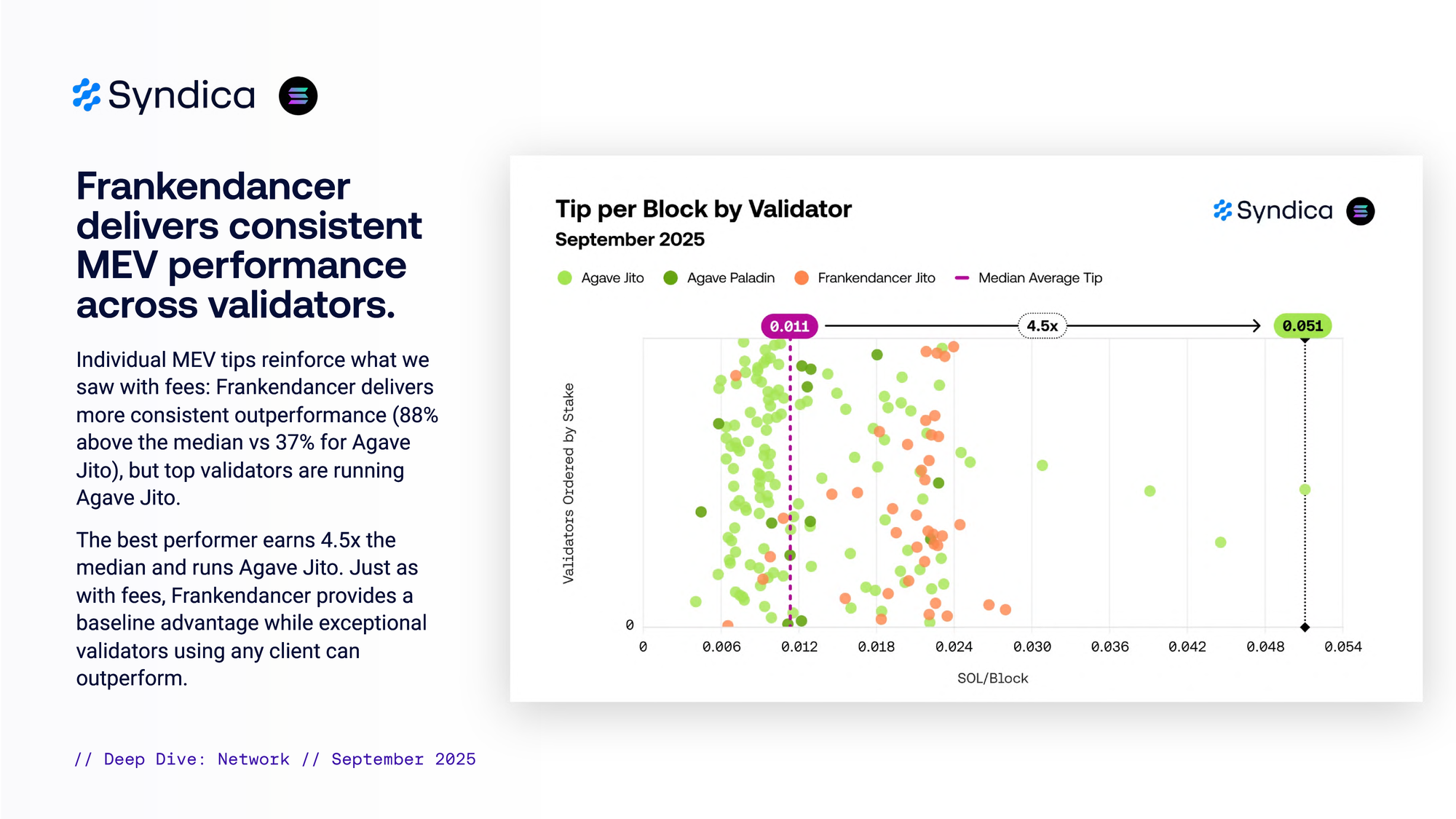 Frankendancer 提供跨验证者的一致 MEV 性能。单独的 MEV 提示强化了我们从费用中看到的情况:Frankendancer 提供更一致的卓越性能(高于中位数 88%,而 Agave Jito 为 37%),但顶级验证者正在运行 Agave Jito。