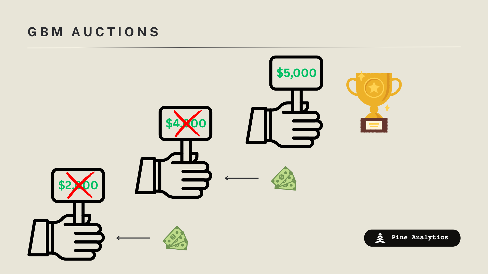GBM 拍卖是一种公开的升价拍卖,竞标者进行逐步提高的竞标,但有一个关键区别:被超额竞标不是损失事件。相反,它会触发自动退款加奖励。