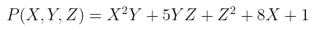 我们还需要定义多项式的 度:它是任何一项中 指数的最高和。在上面的例子中,项$X²Y$的度为 3(因为$2 + 1 = 3$),这是任何一项的最高度,因此$P$的度为 3。