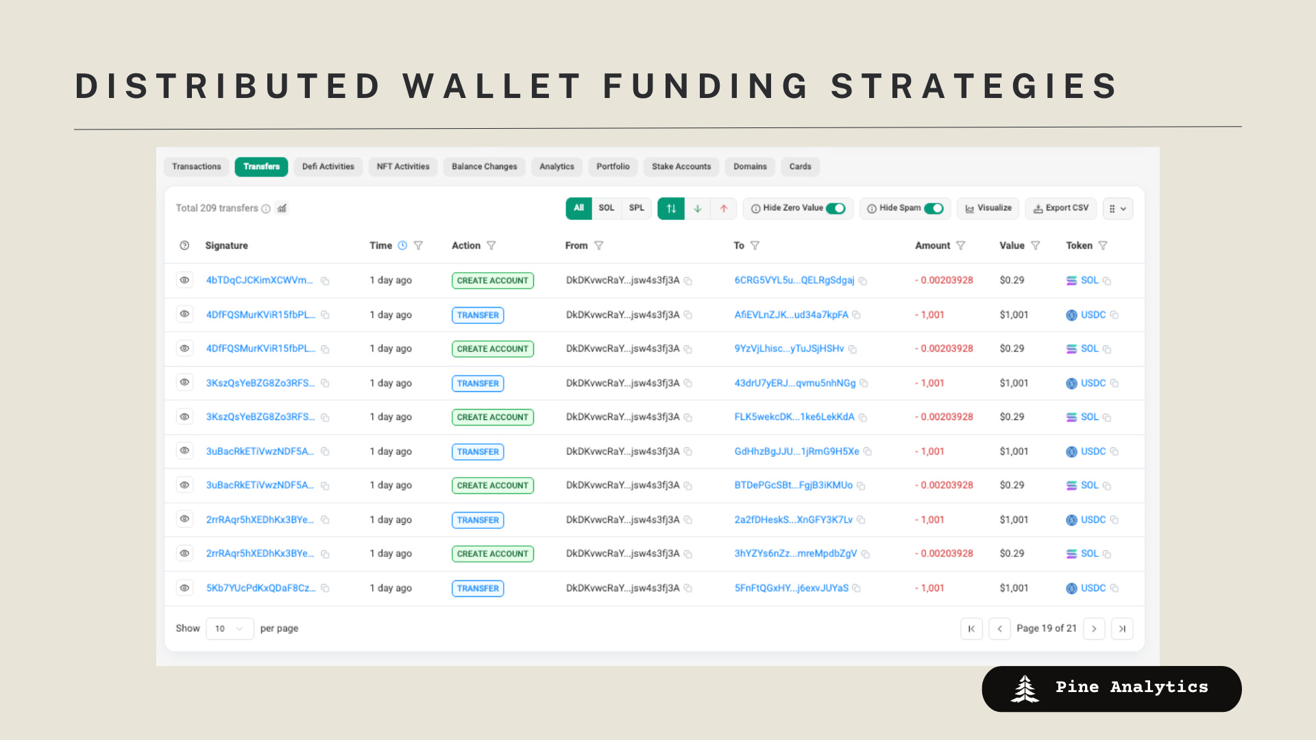 在本分析中,我们通过检查共享的执行行为、资金模式和交易结构来识别钱包集群。具体来说,我们将使用相同优先级费用或相同 Jito 小费金额的钱包分组,显示同步的交易时间,或源自共同的资金来源(例如 CEX)。我们还通过链上流动连接钱包,跟踪资金如何在地址之间移动,以揭示协调活动。