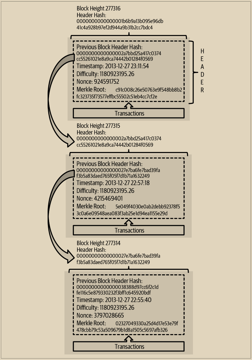 nonce(随机数)、目标值和时间戳在挖矿过程中使用,并将在第12章中进行更详细的讨论。